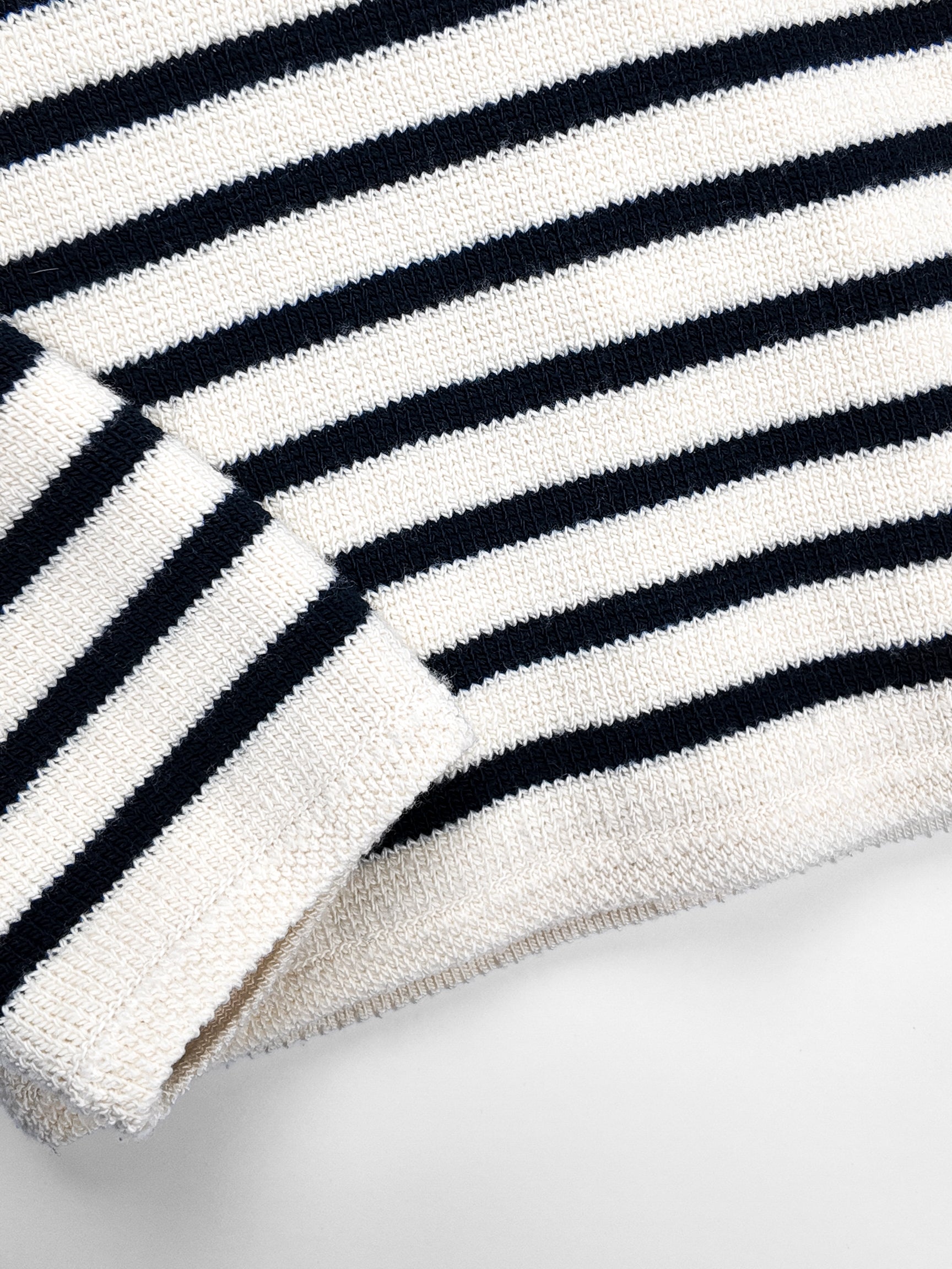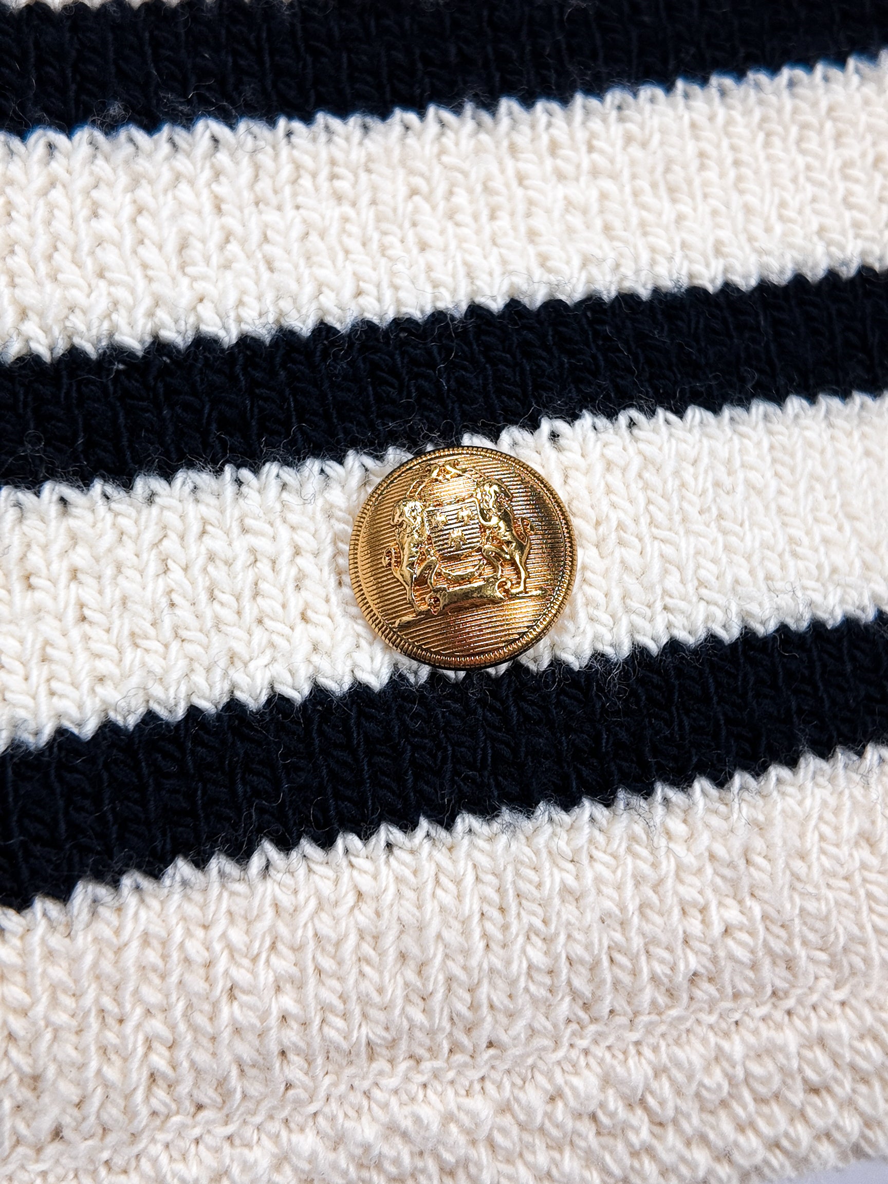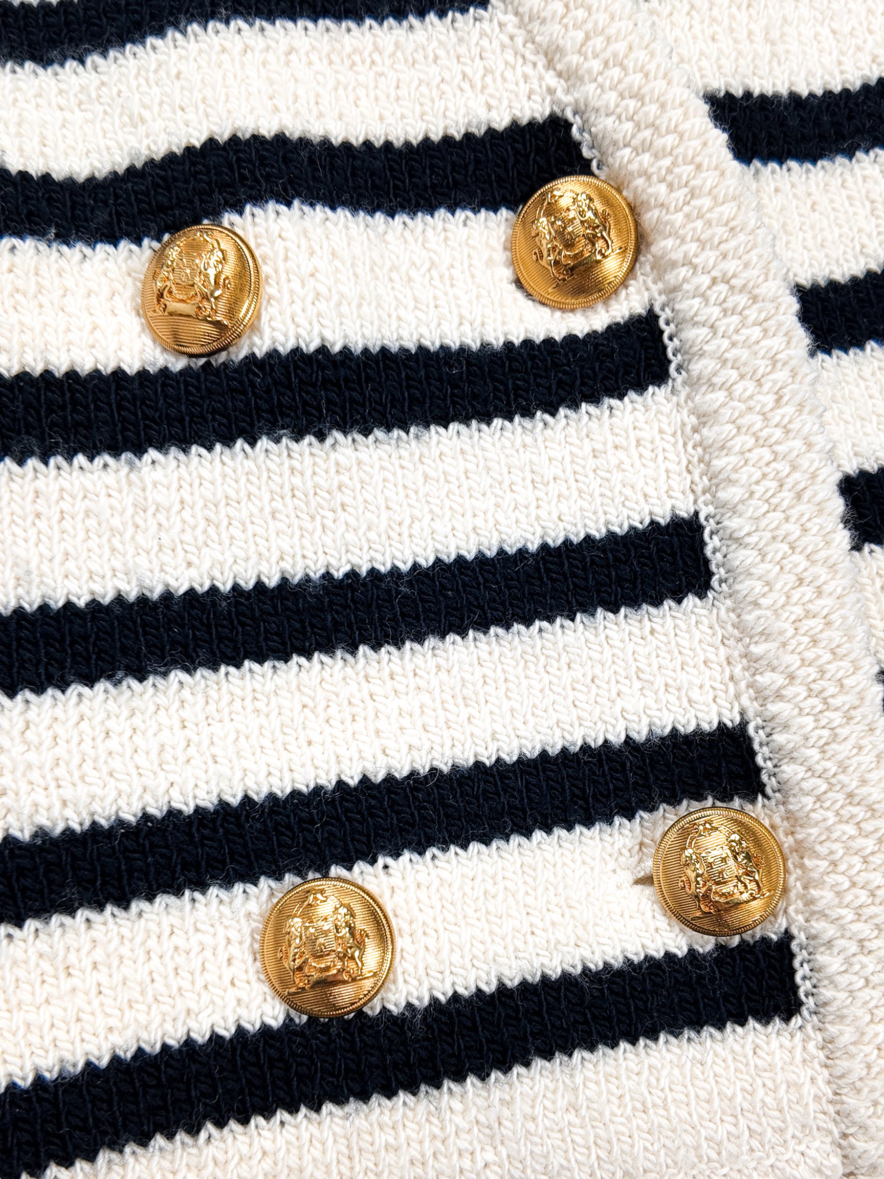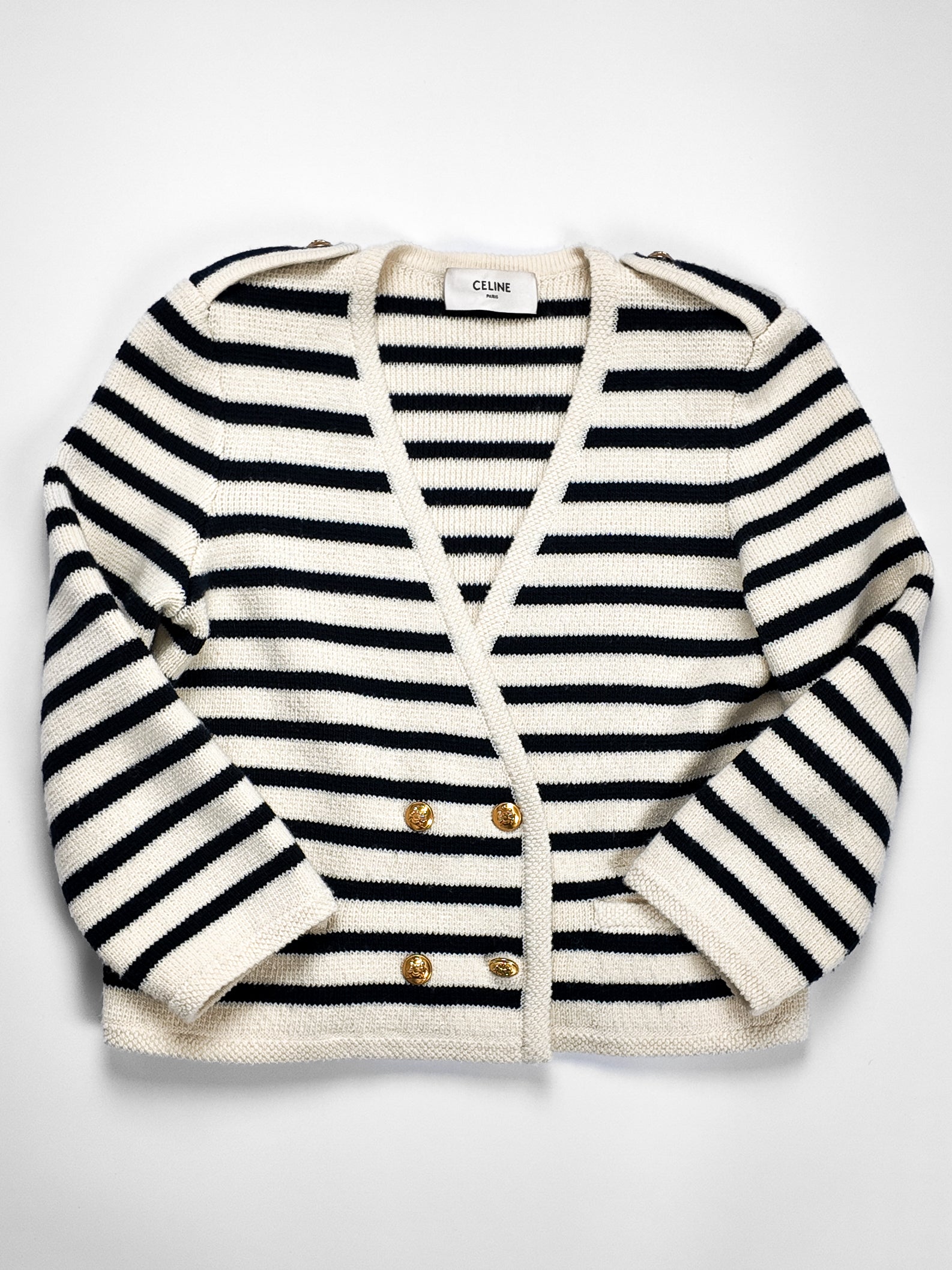 A timeless Celine piece with a nautical twist, this cropped cardigan features classic navy and ivory stripes, gold-tone button detailing, and a double-breasted V-neck silhouette. Crafted from a soft, lightweight knit, it’s perfect for layering and adds effortless polish to any look.
