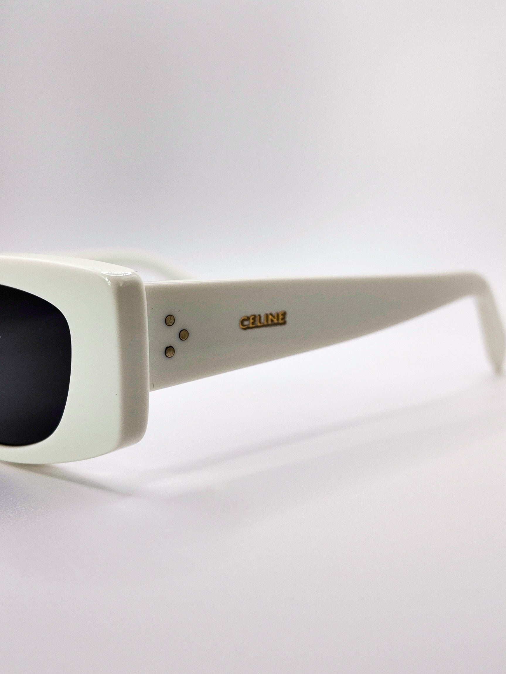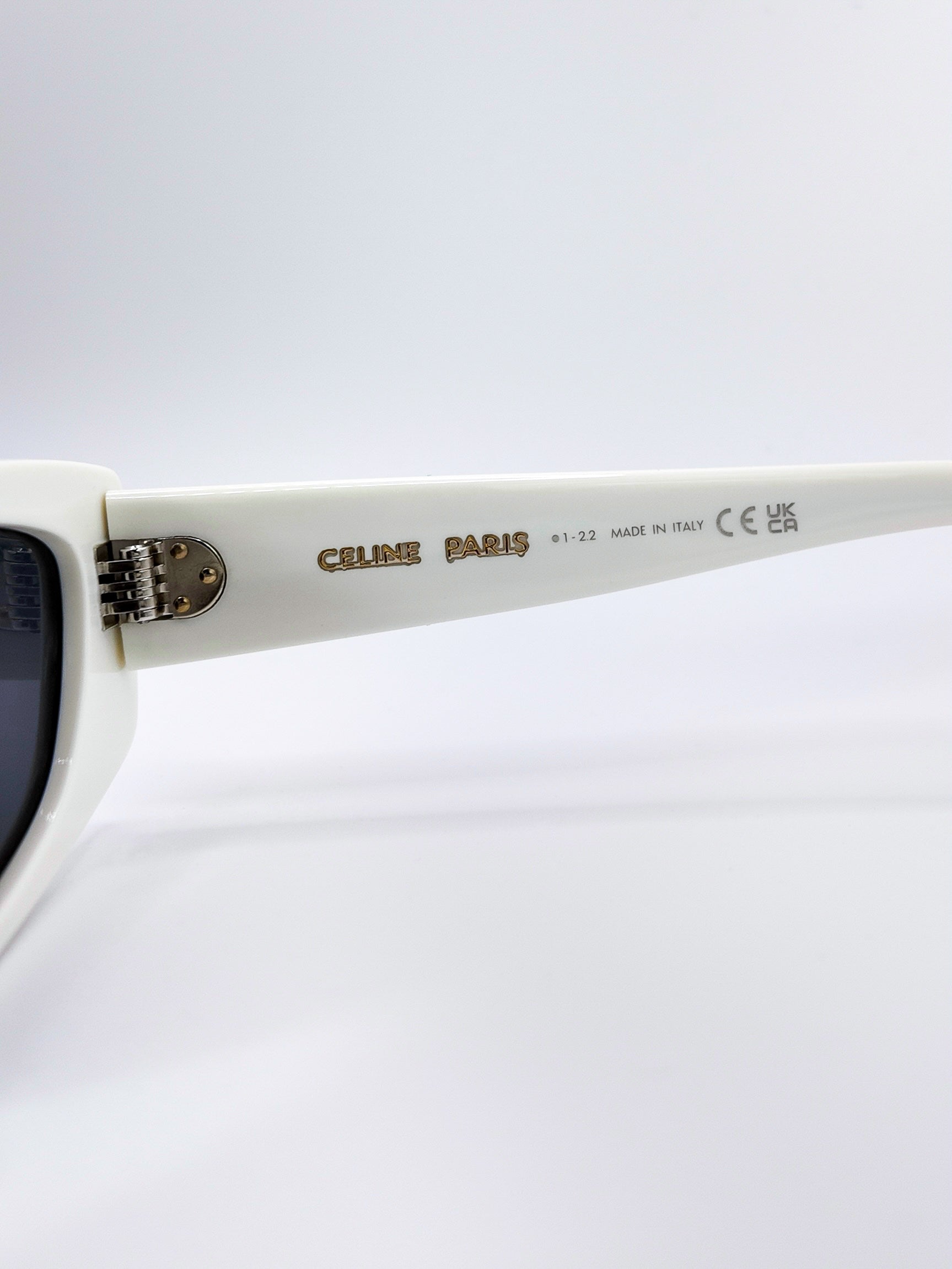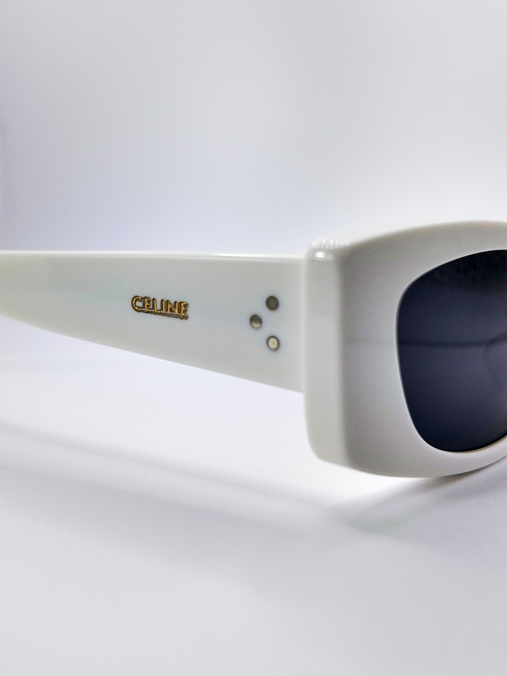 The Celine Graphic S258 Sunglasses deliver bold modernity with a sleek rectangular silhouette in glossy white acetate. Featuring dark lenses and wide temples stamped with the gold Celine logo, they embody the house’s minimal yet statement-driven aesthetic. Effortlessly balancing sharp lines with everyday wearability, this design is a standout in contemporary eyewear. Brand new, this pair comes complete with its box and case.