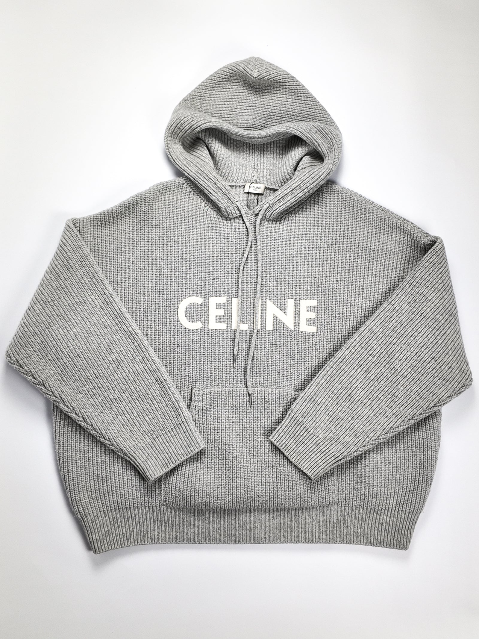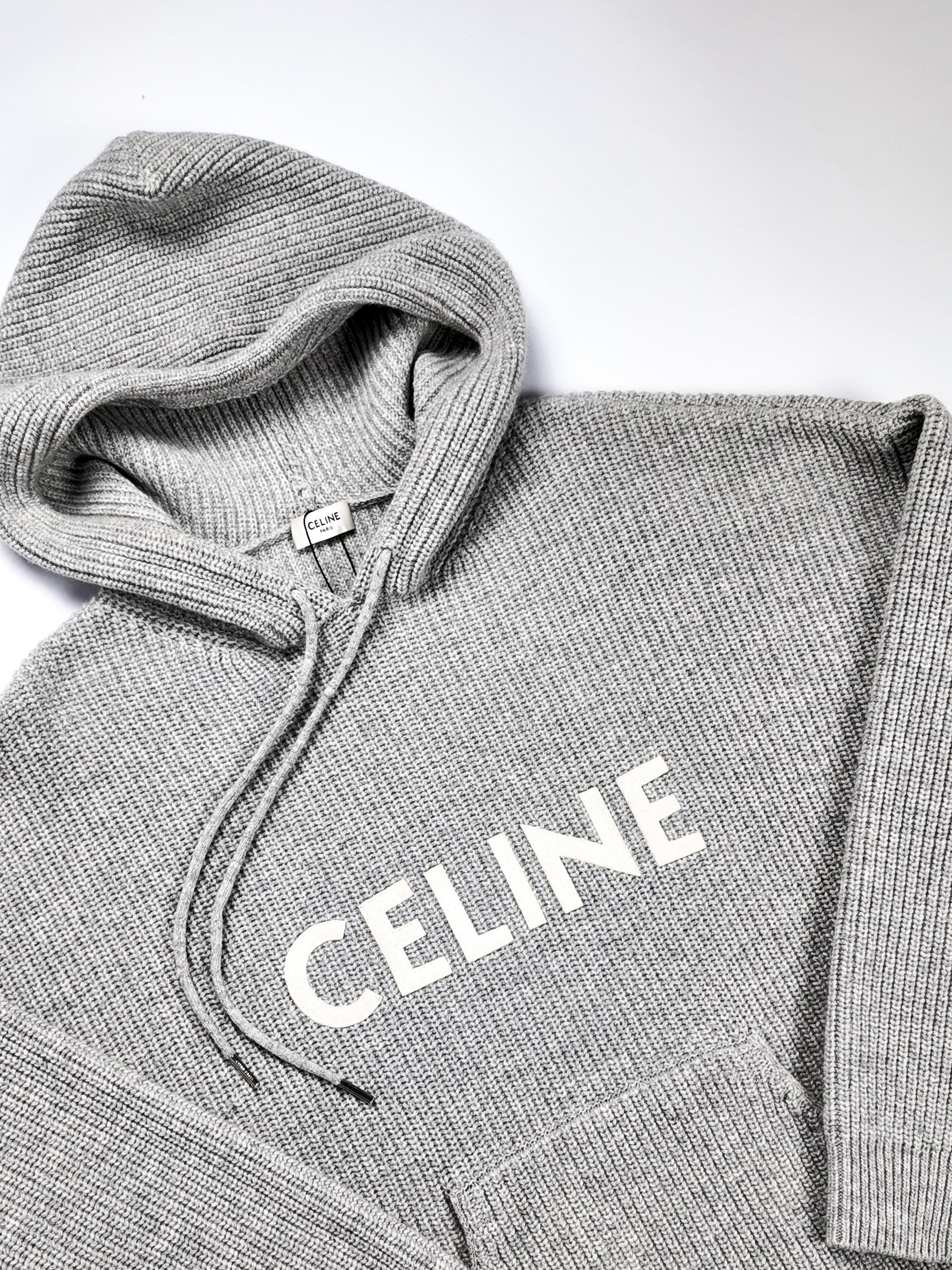 This Celine ribbed knit hoodie captures the brand’s effortless Parisian minimalism. Crafted in soft grey wool with the signature CELINE logo across the chest, it features a relaxed silhouette, drawstring hood, and kangaroo pocket. A refined take on casual wear that pairs comfort with understated luxury. Pre-loved and in excellent condition.
