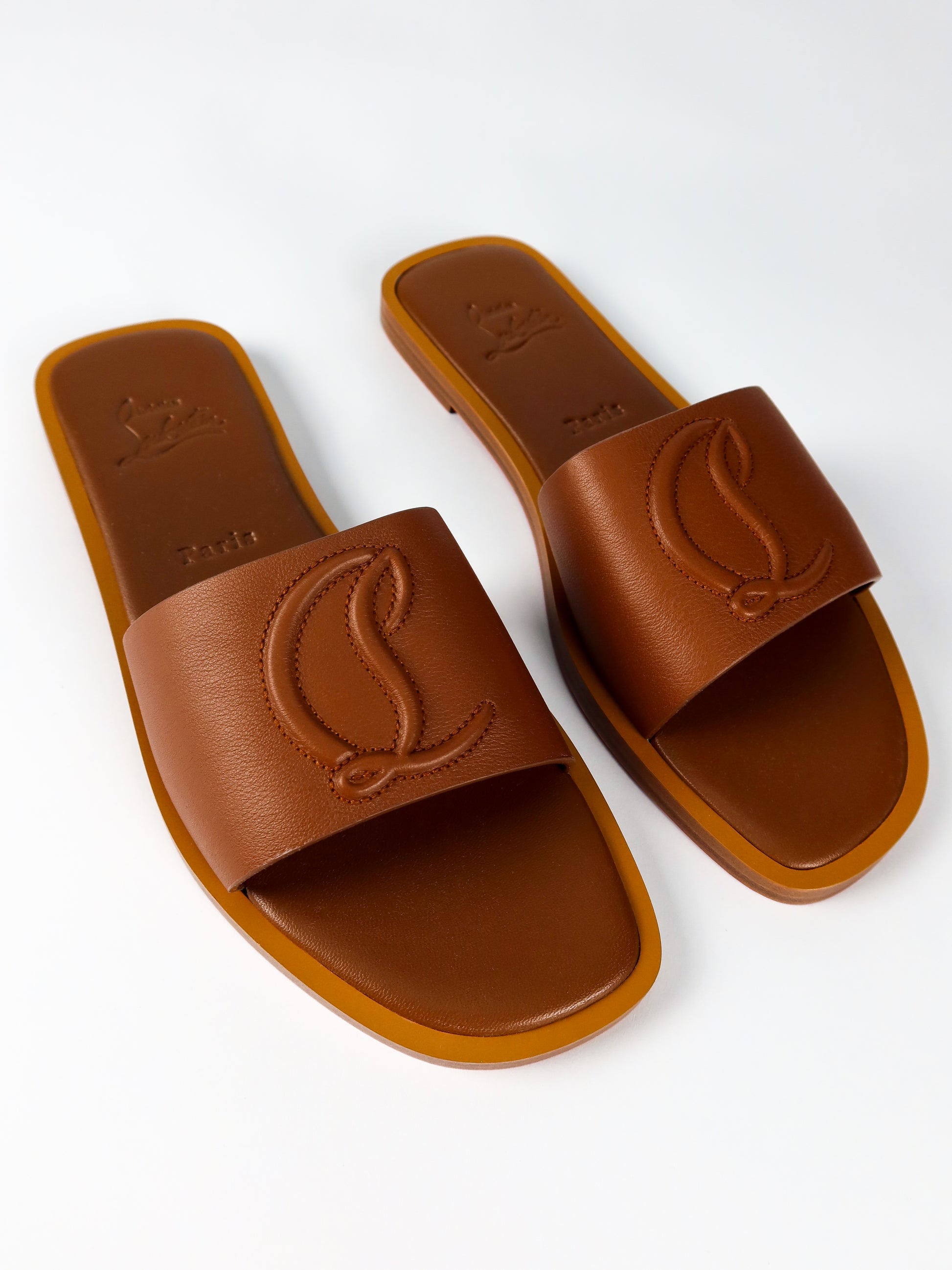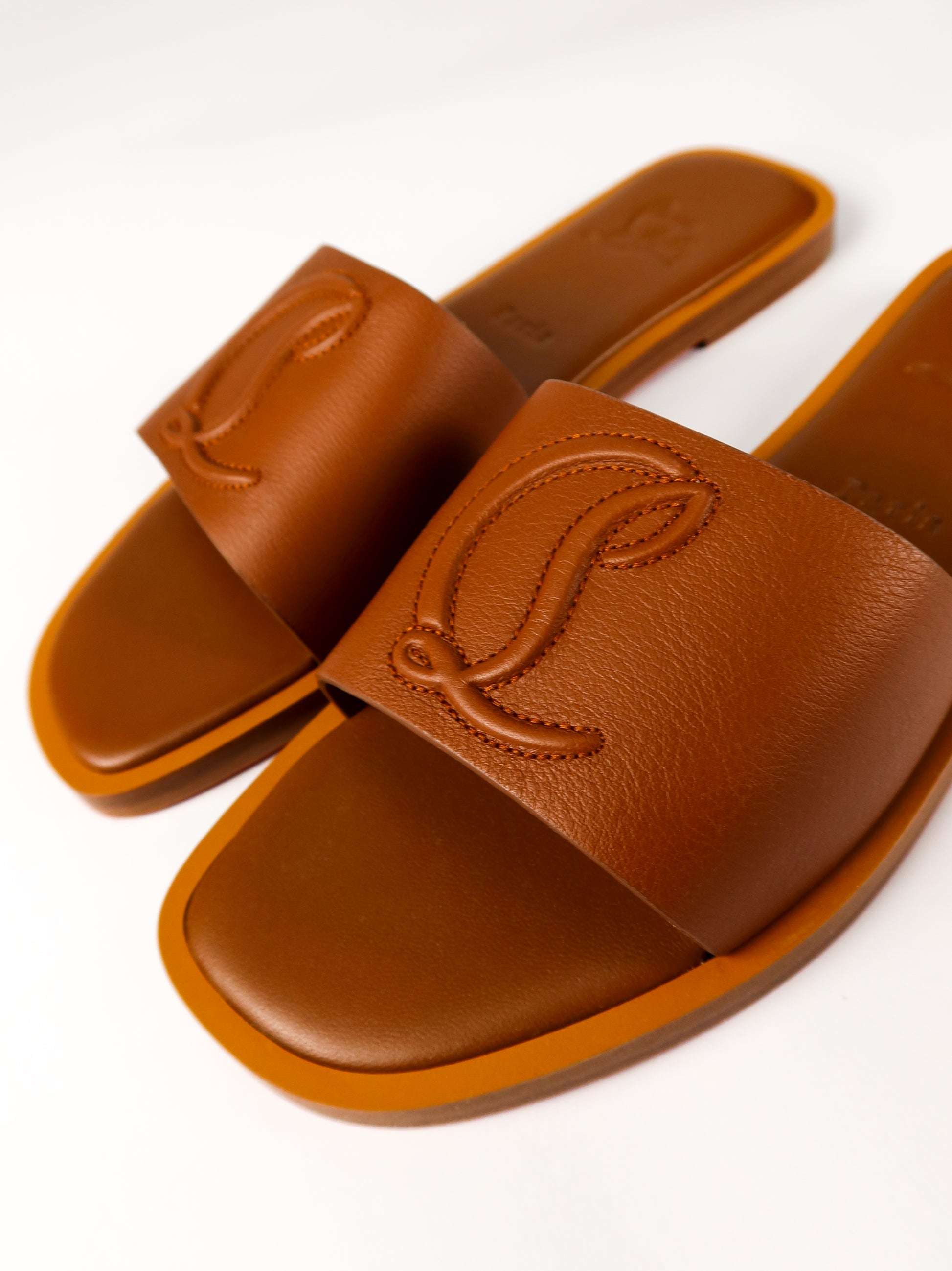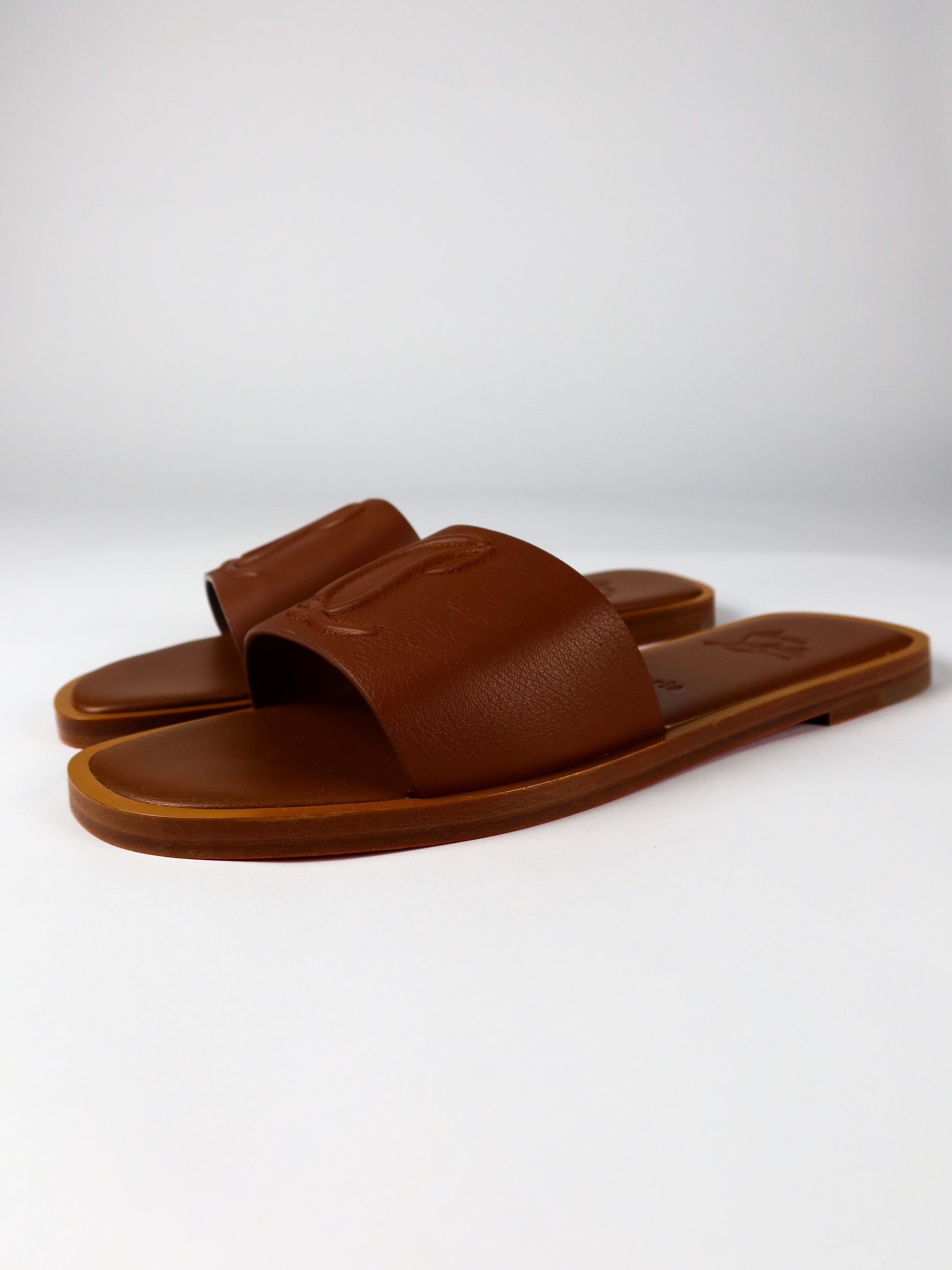 A refined warm-weather staple from Christian Louboutin, these brand new mules blend understated elegance with the house’s signature craftsmanship. Made in a rich caramel-brown leather, the design features a wide, smooth strap embossed with Louboutin’s iconic “CL” monogram for a subtle yet unmistakable finish. The minimalist silhouette sits on a comfortable flat sole, offering effortless wear from day to evening. Complete with original tags, they’re a versatile addition to any luxury wardrobe—perfect for pairing with everything from relaxed tailoring to summer dresses.