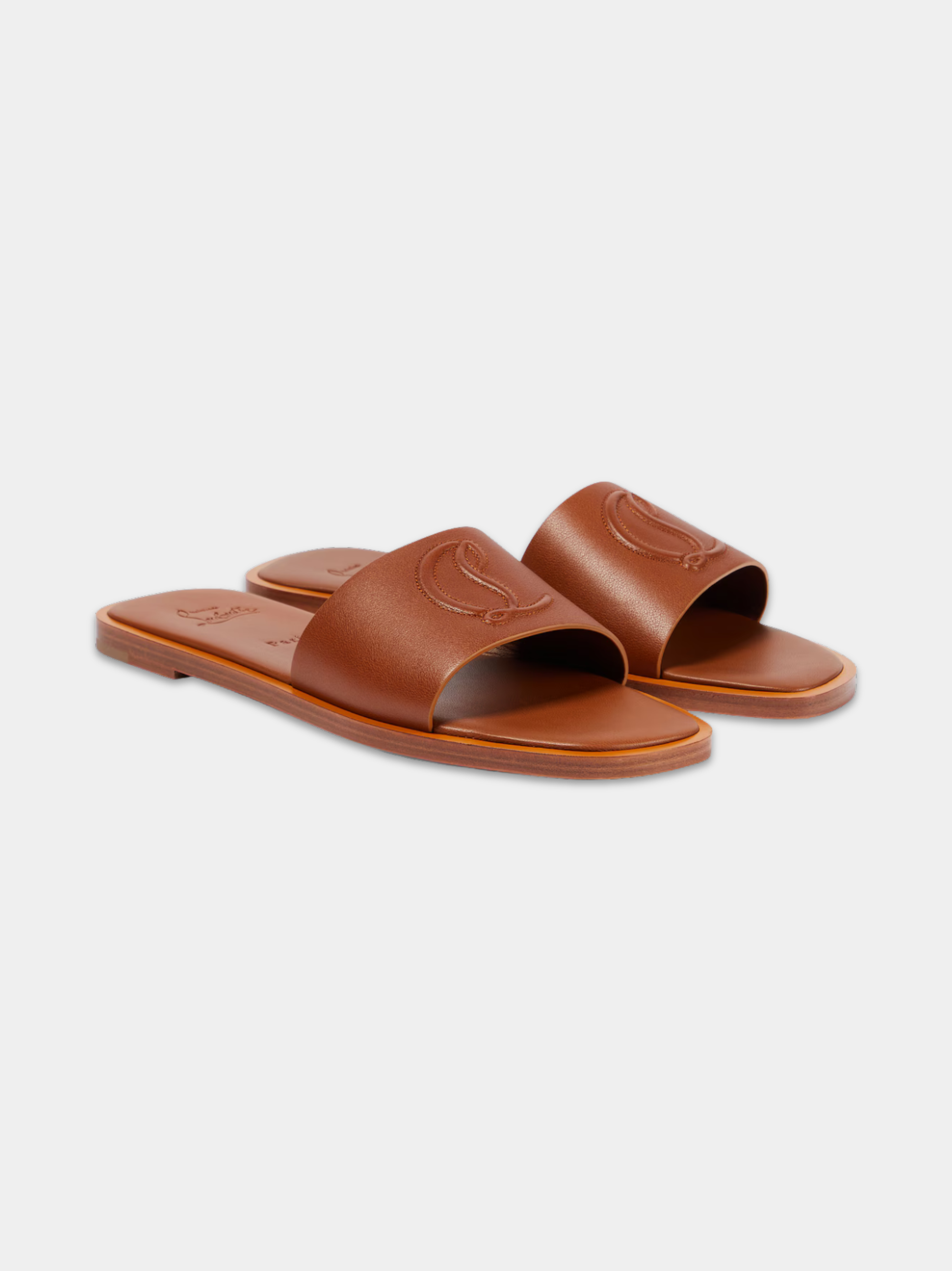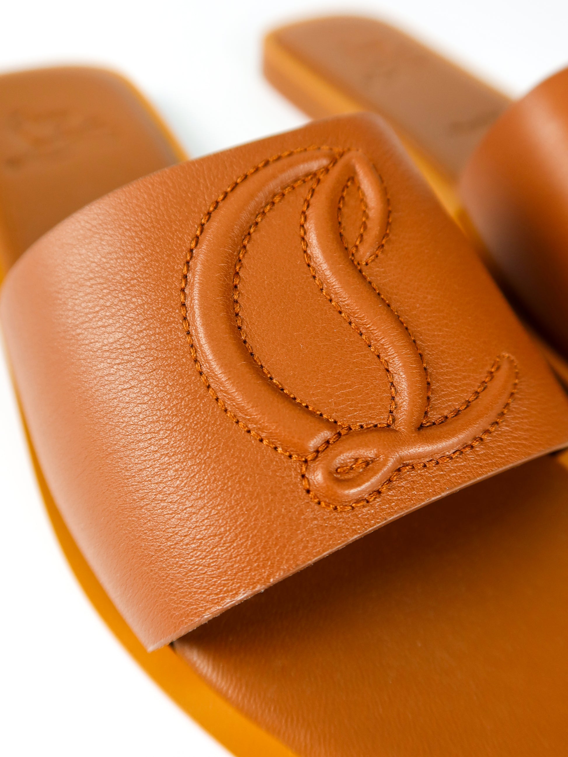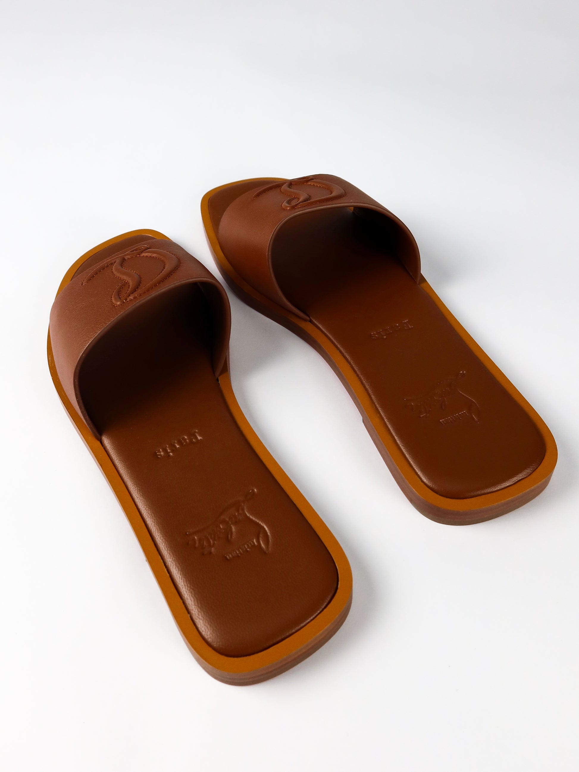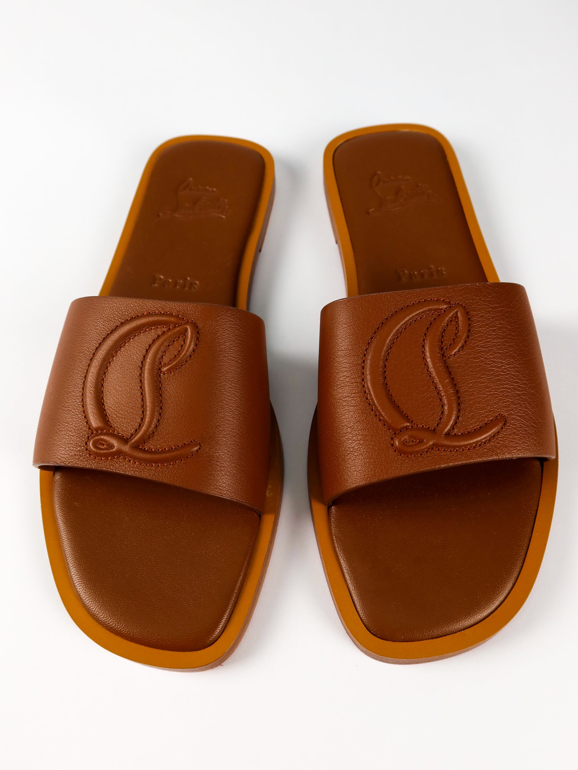 A refined warm-weather staple from Christian Louboutin, these brand new mules blend understated elegance with the house’s signature craftsmanship. Made in a rich caramel-brown leather, the design features a wide, smooth strap embossed with Louboutin’s iconic “CL” monogram for a subtle yet unmistakable finish. The minimalist silhouette sits on a comfortable flat sole, offering effortless wear from day to evening. Complete with original tags, they’re a versatile addition to any luxury wardrobe—perfect for pairing with everything from relaxed tailoring to summer dresses.