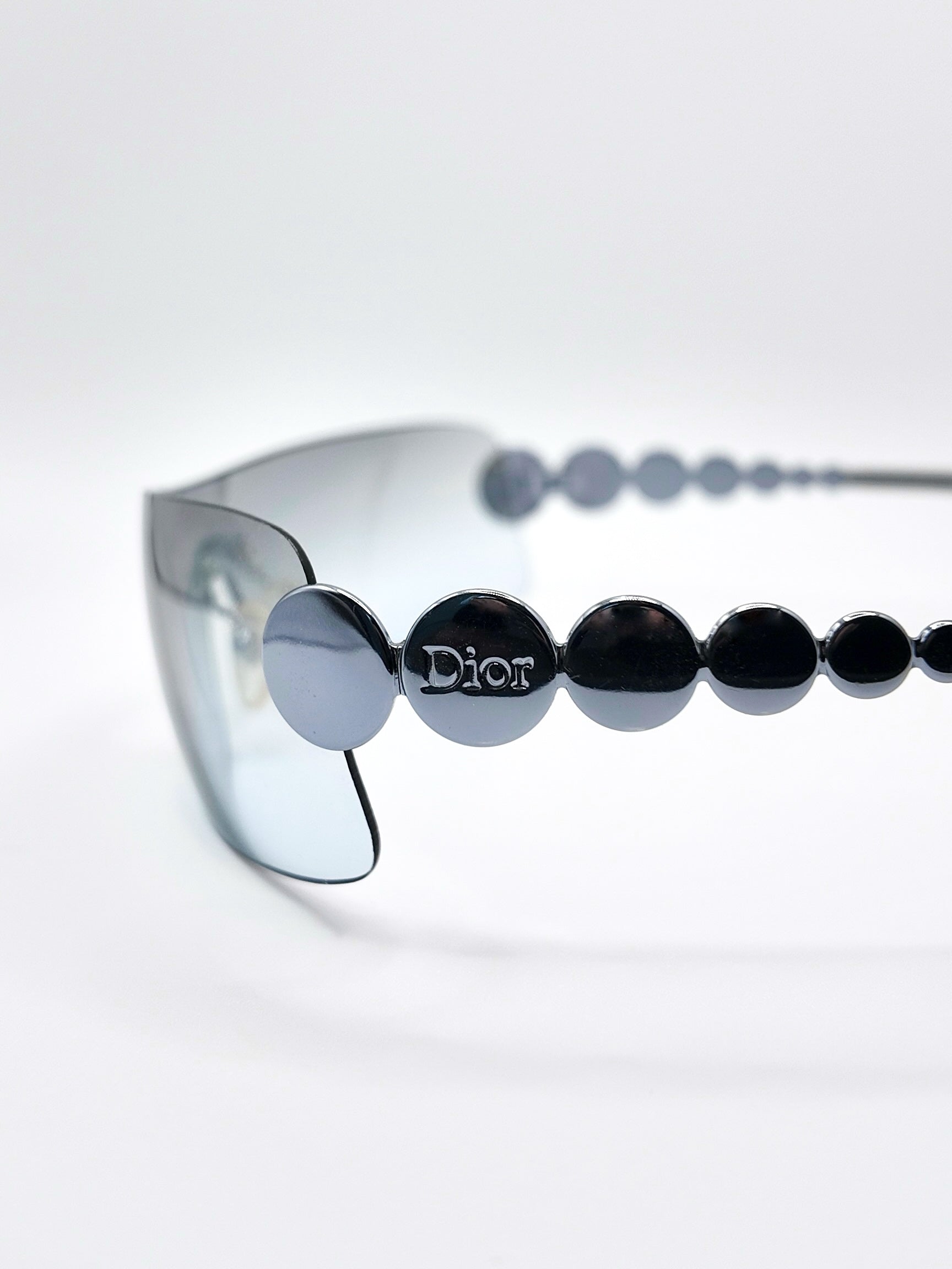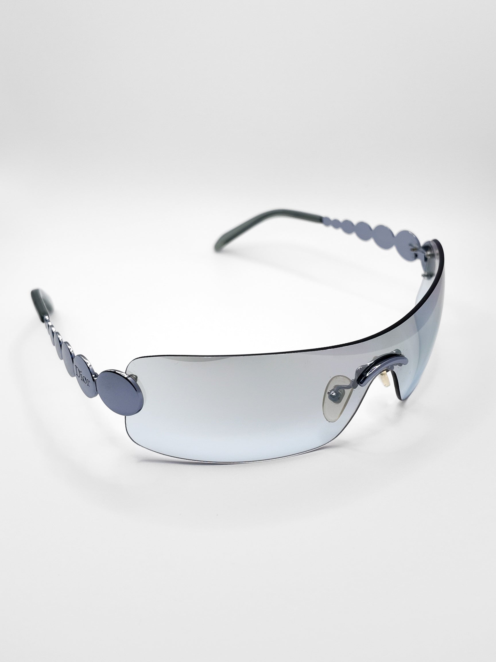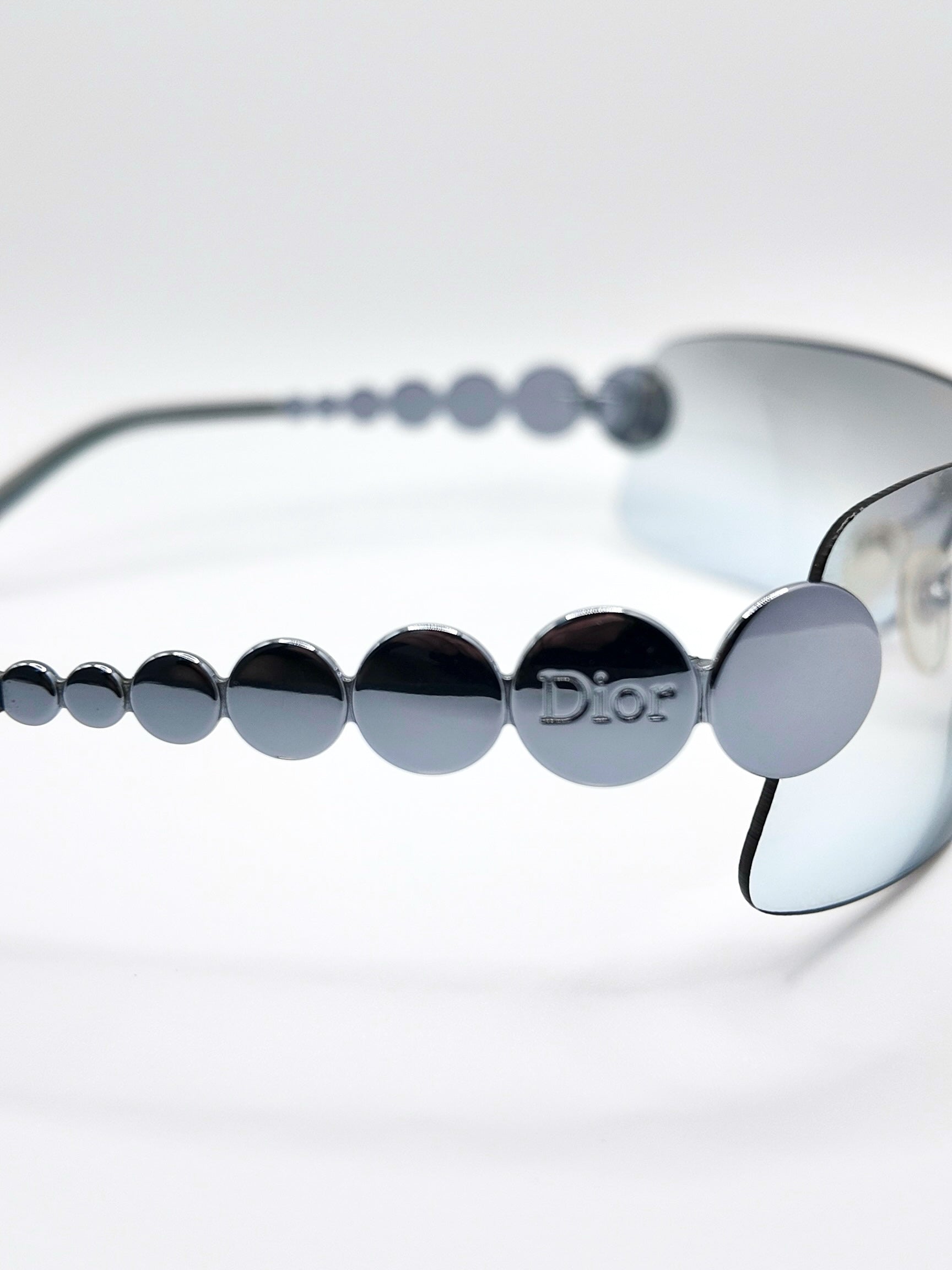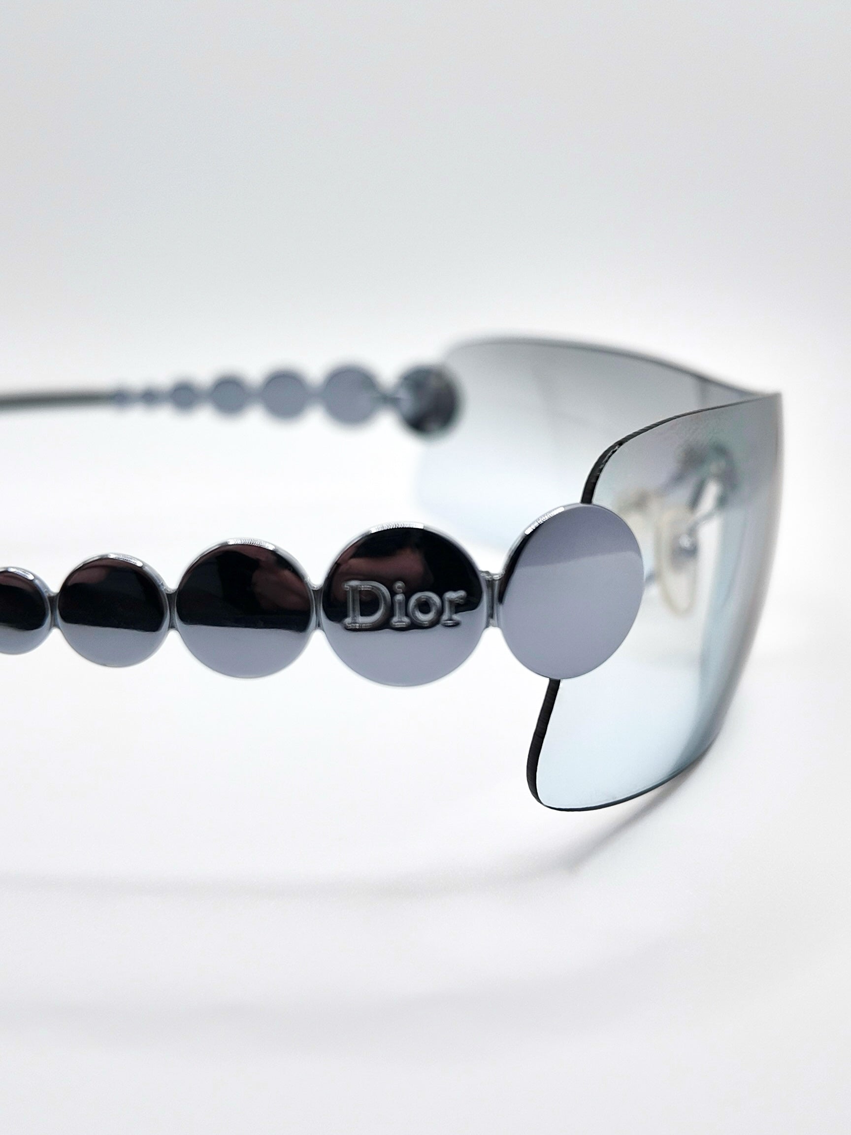Make a sleek statement with these vintage Dior Ruthenium/N sunglasses—an early 2000s icon that oozes futuristic flair. Featuring a frameless shield lens with a cool blue gradient tint and signature Dior circle-detail arms in ruthenium-tone metal. Vintage and in excellent condition, these are a rare find and can make any outfit.