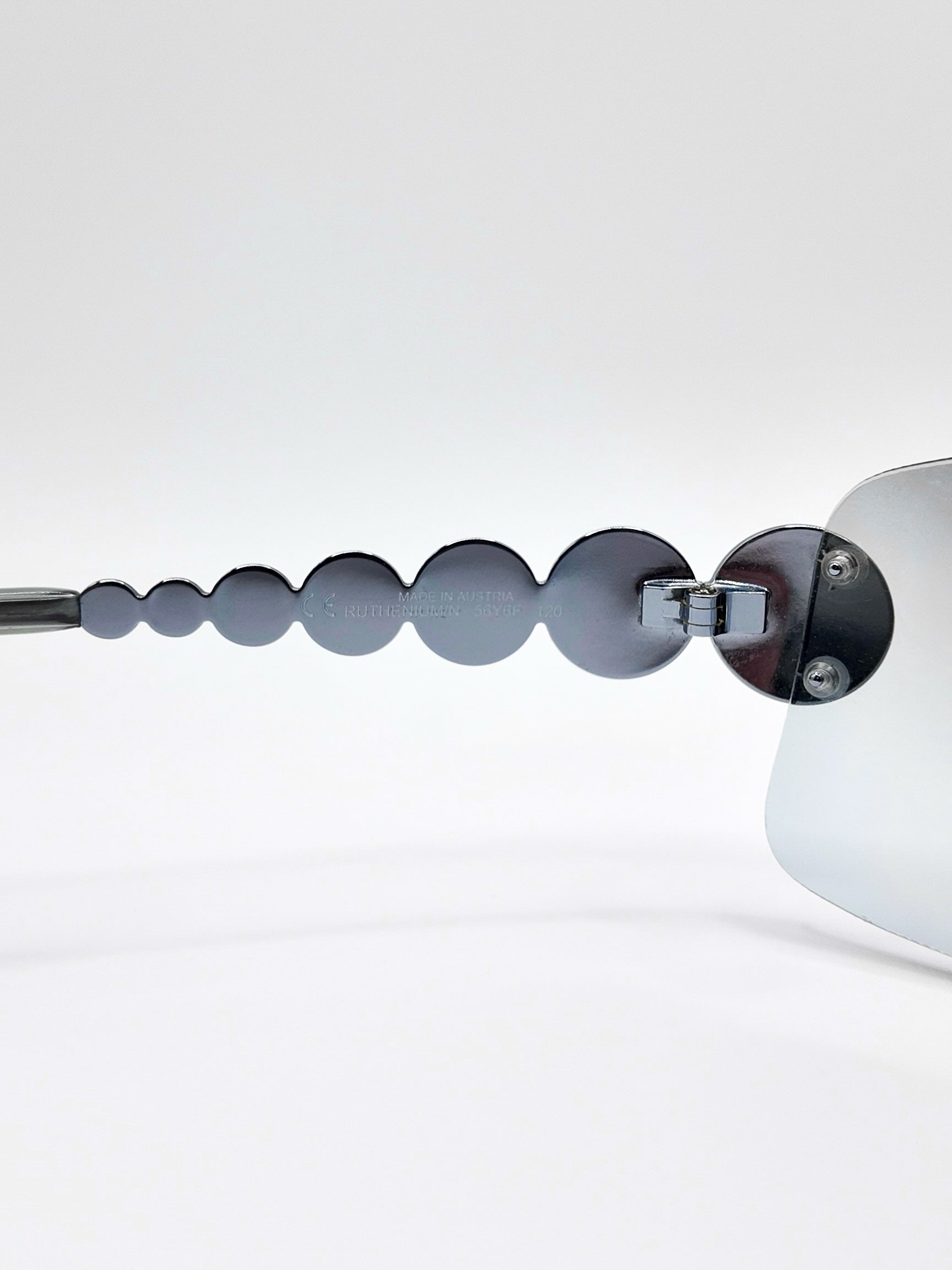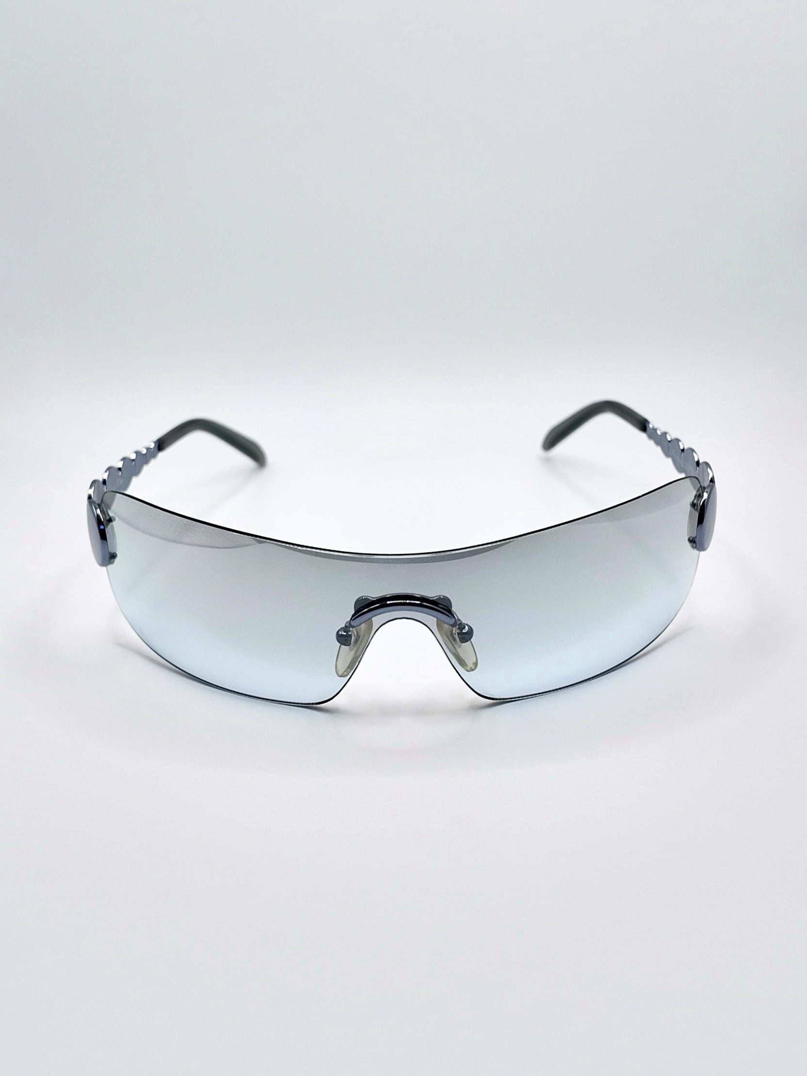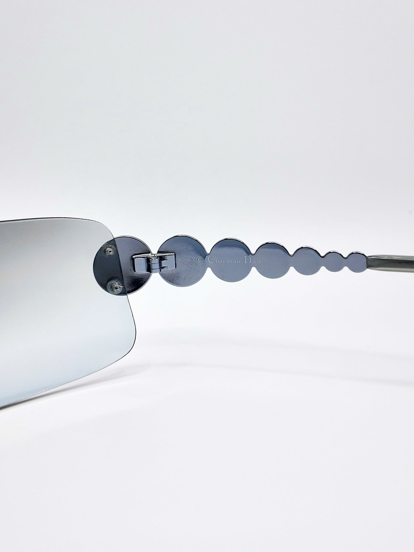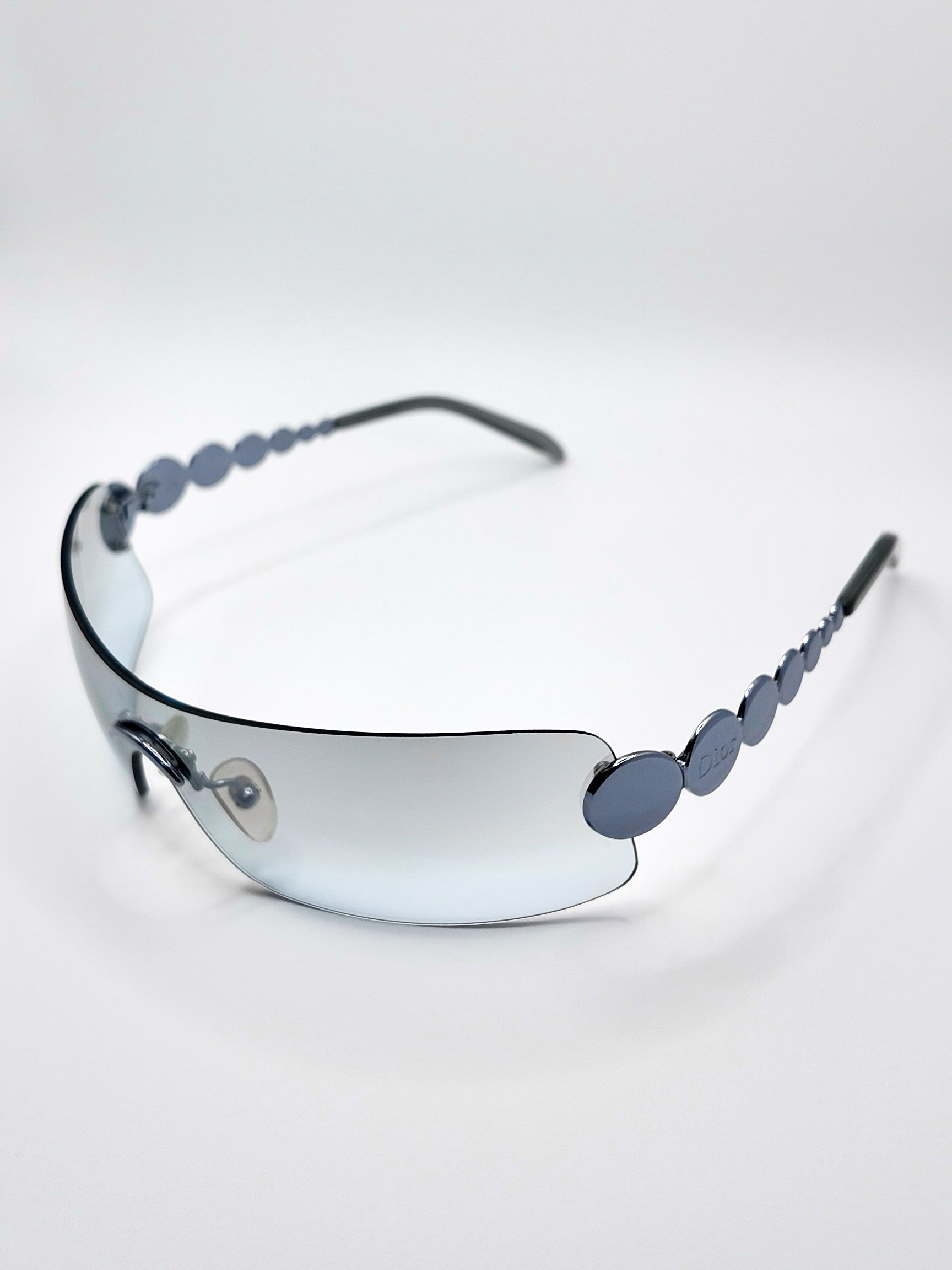 Make a sleek statement with these vintage Dior Ruthenium/N sunglasses—an early 2000s icon that oozes futuristic flair. Featuring a frameless shield lens with a cool blue gradient tint and signature Dior circle-detail arms in ruthenium-tone metal. Vintage and in excellent condition, these are a rare find and can make any outfit.