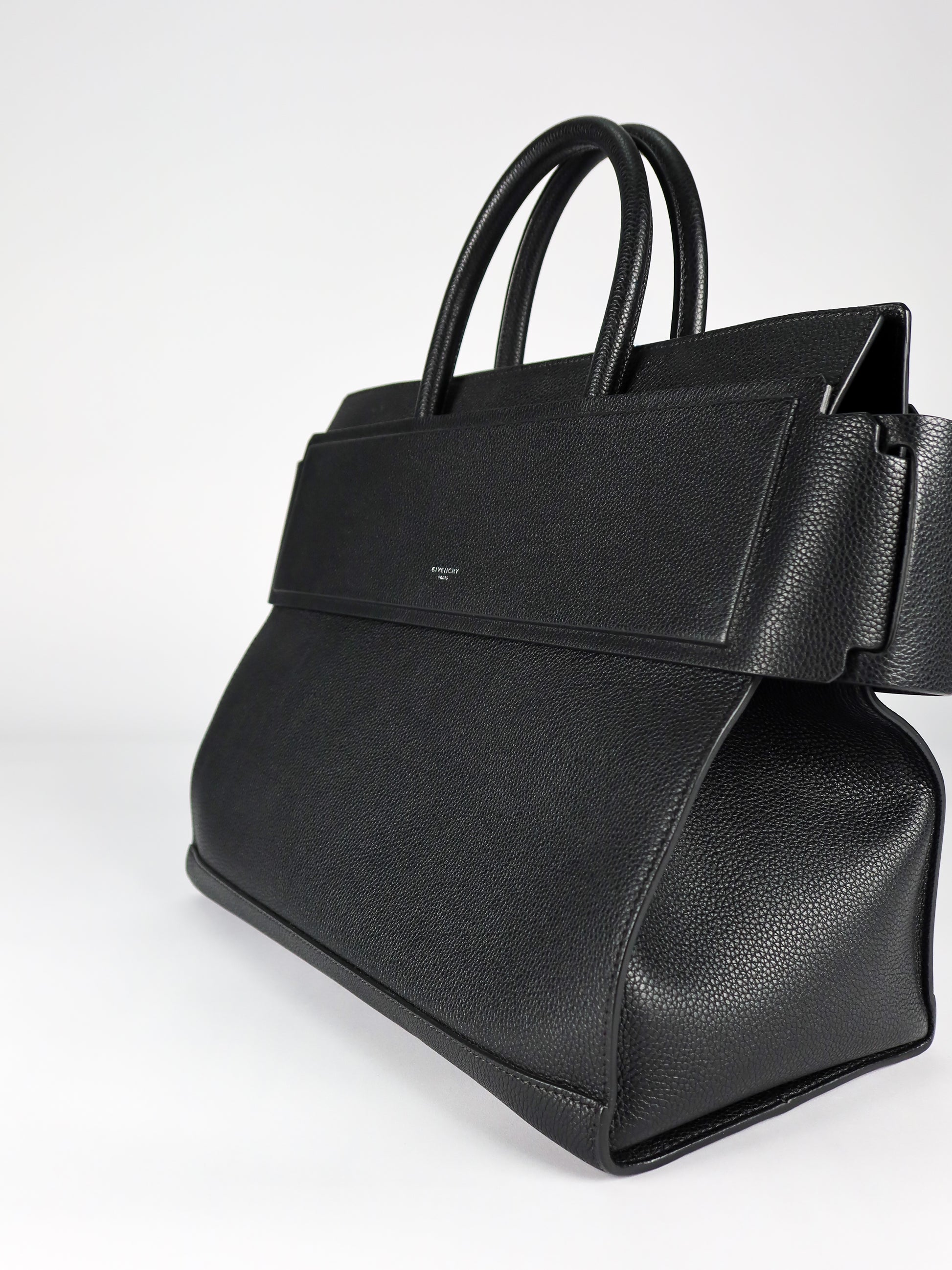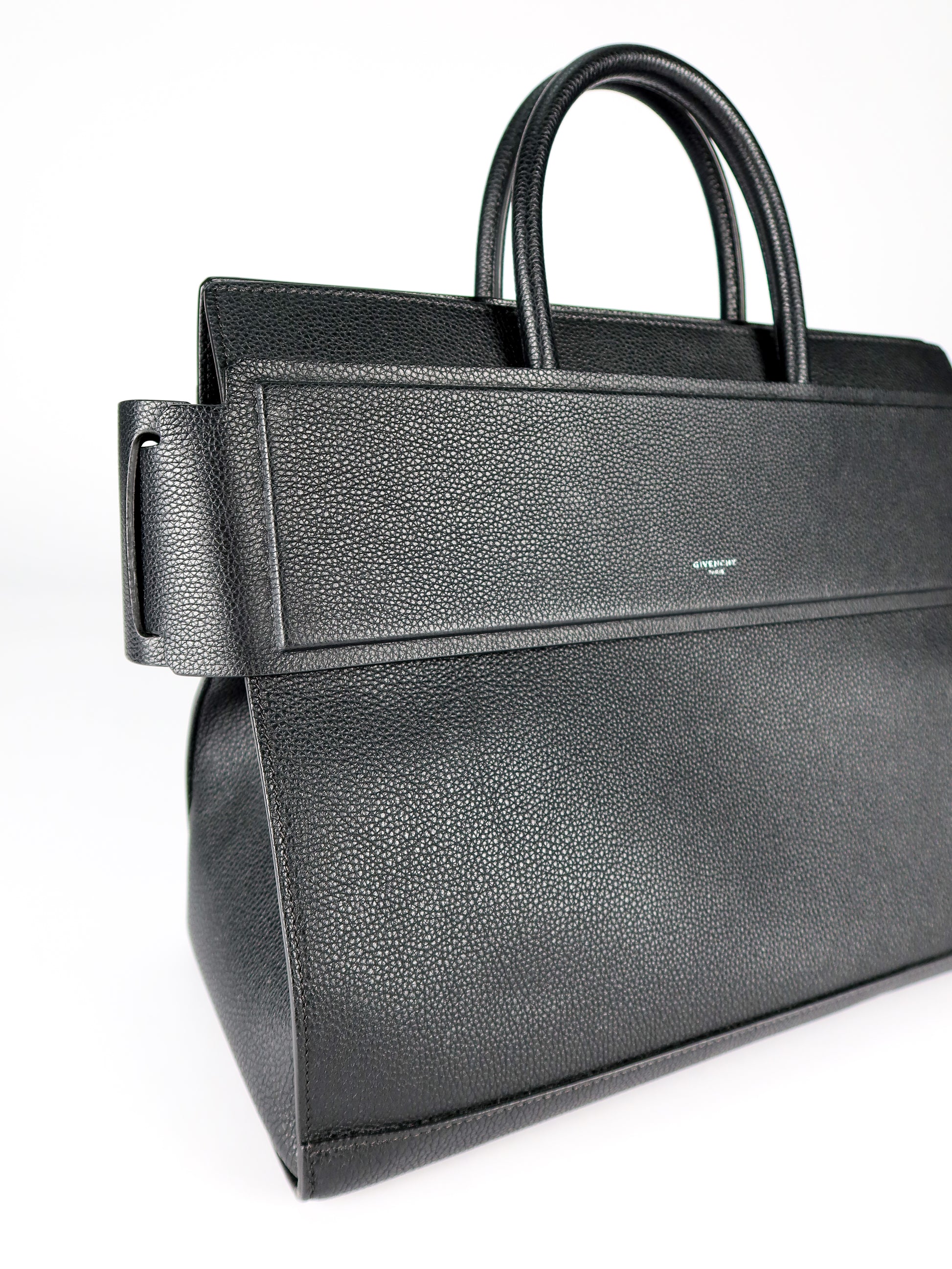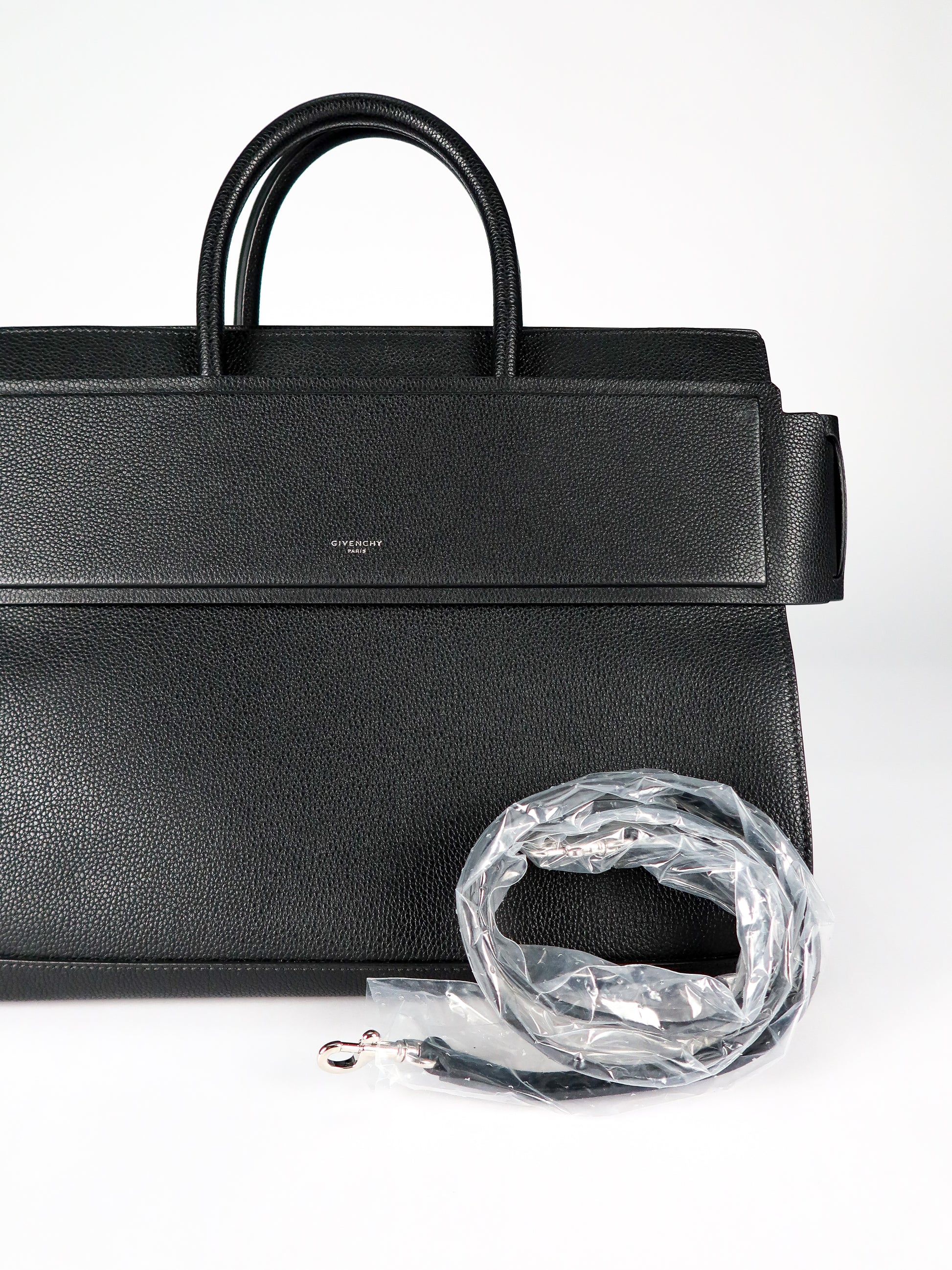 Crafted in supple black grained leather, the Givenchy Horizon Bag is a study in structured elegance. Its clean architectural lines are accented with subtle branding and polished silver-tone hardware. Designed with top handles and a detachable shoulder strap, it offers both functionality and timeless sophistication. Brand new with tags, this piece comes complete with its dust bag and strap.
