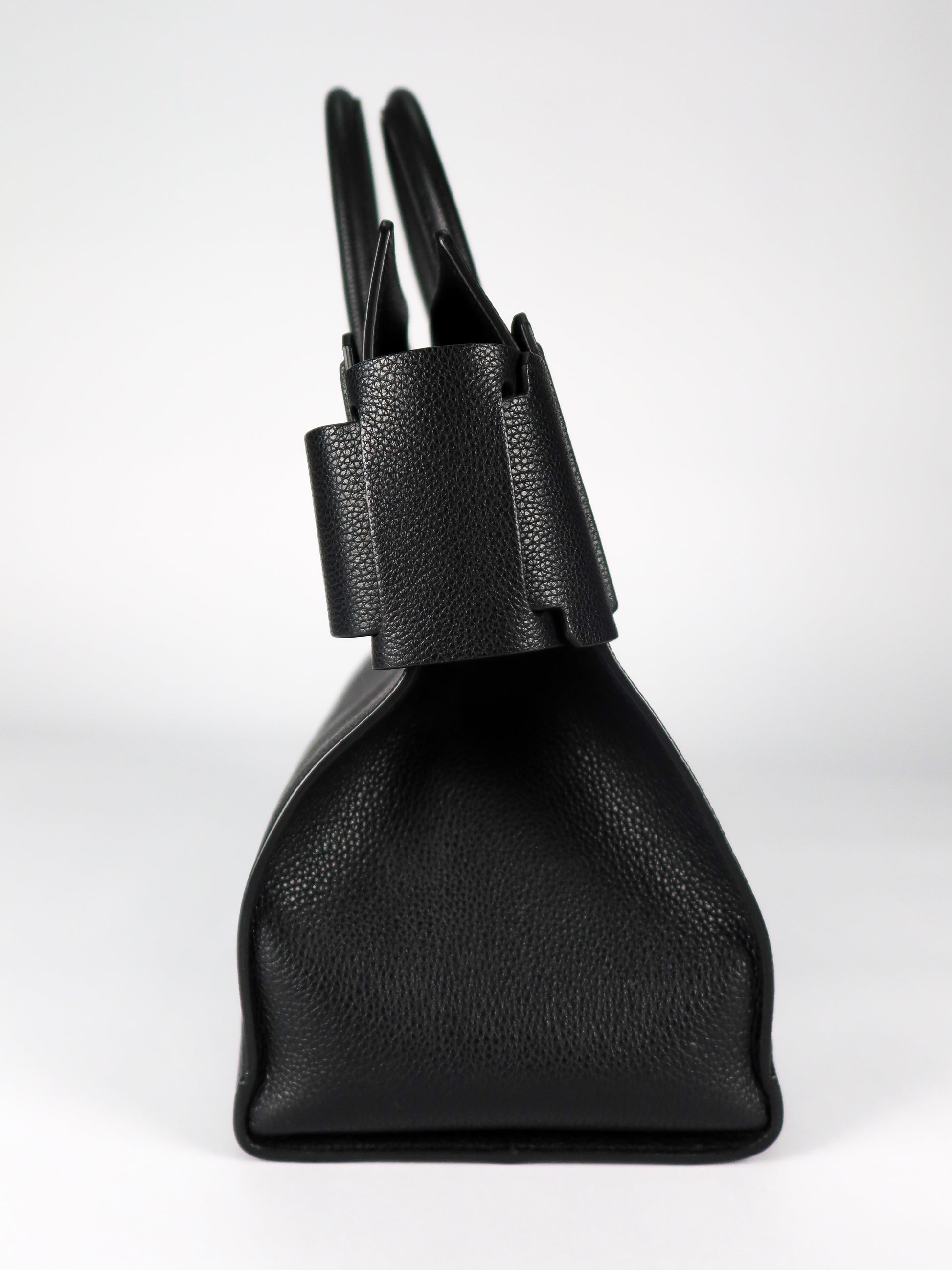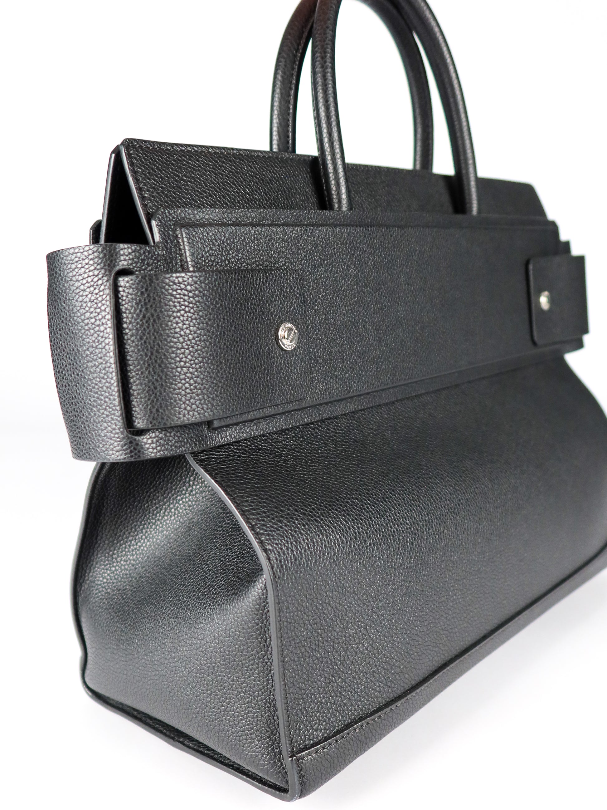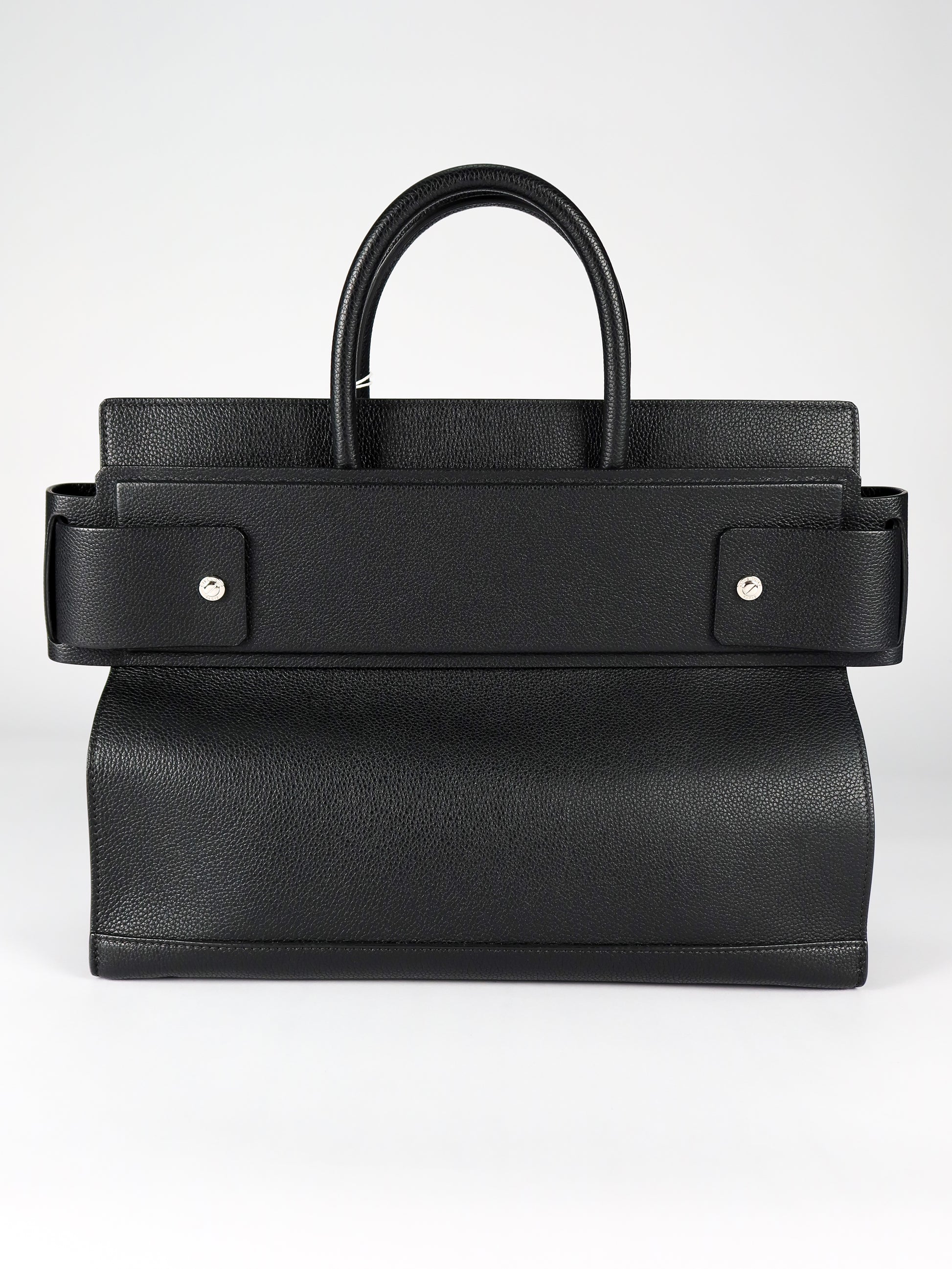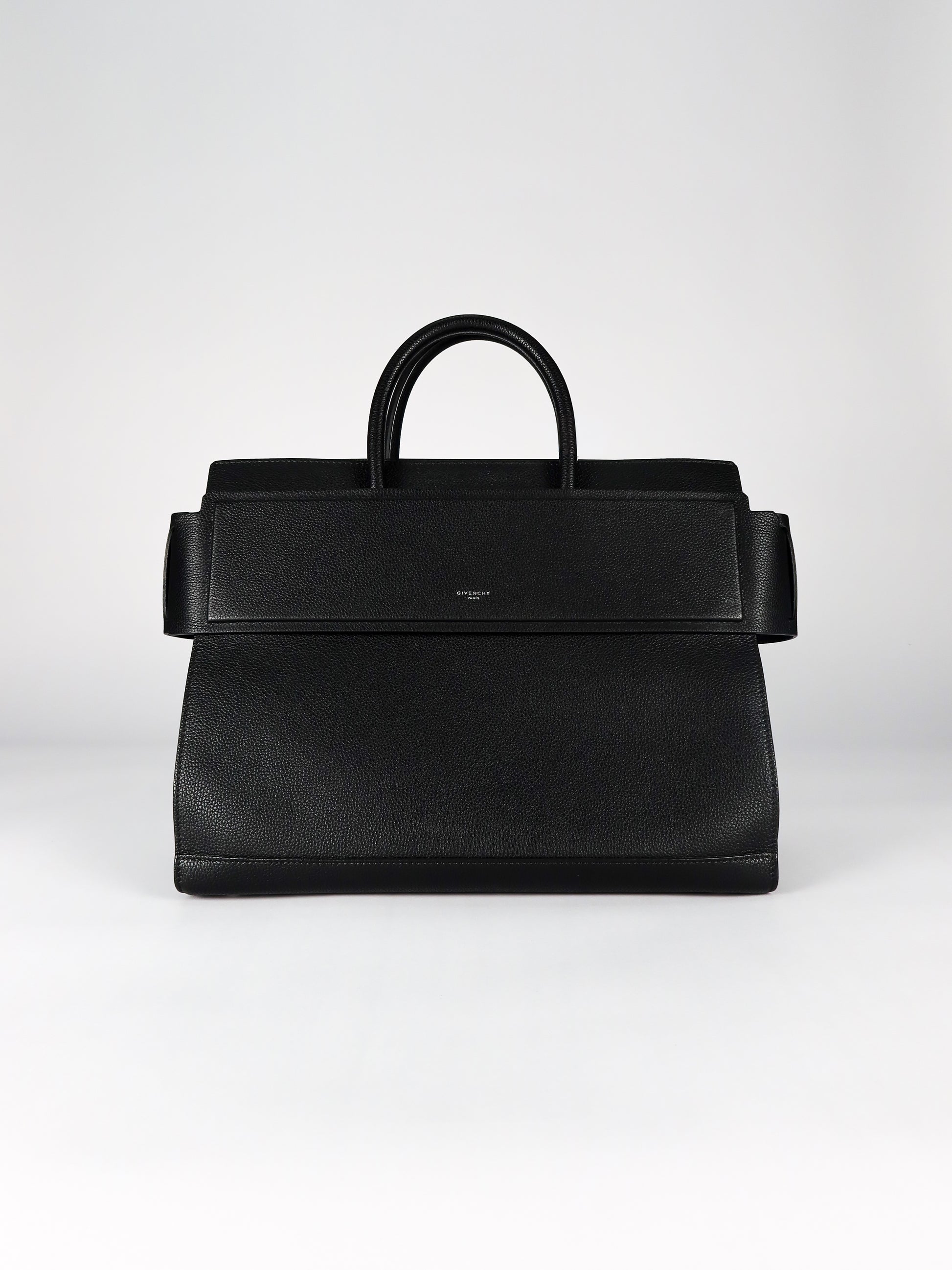 Crafted in supple black grained leather, the Givenchy Horizon Bag is a study in structured elegance. Its clean architectural lines are accented with subtle branding and polished silver-tone hardware. Designed with top handles and a detachable shoulder strap, it offers both functionality and timeless sophistication. Brand new with tags, this piece comes complete with its dust bag and strap.