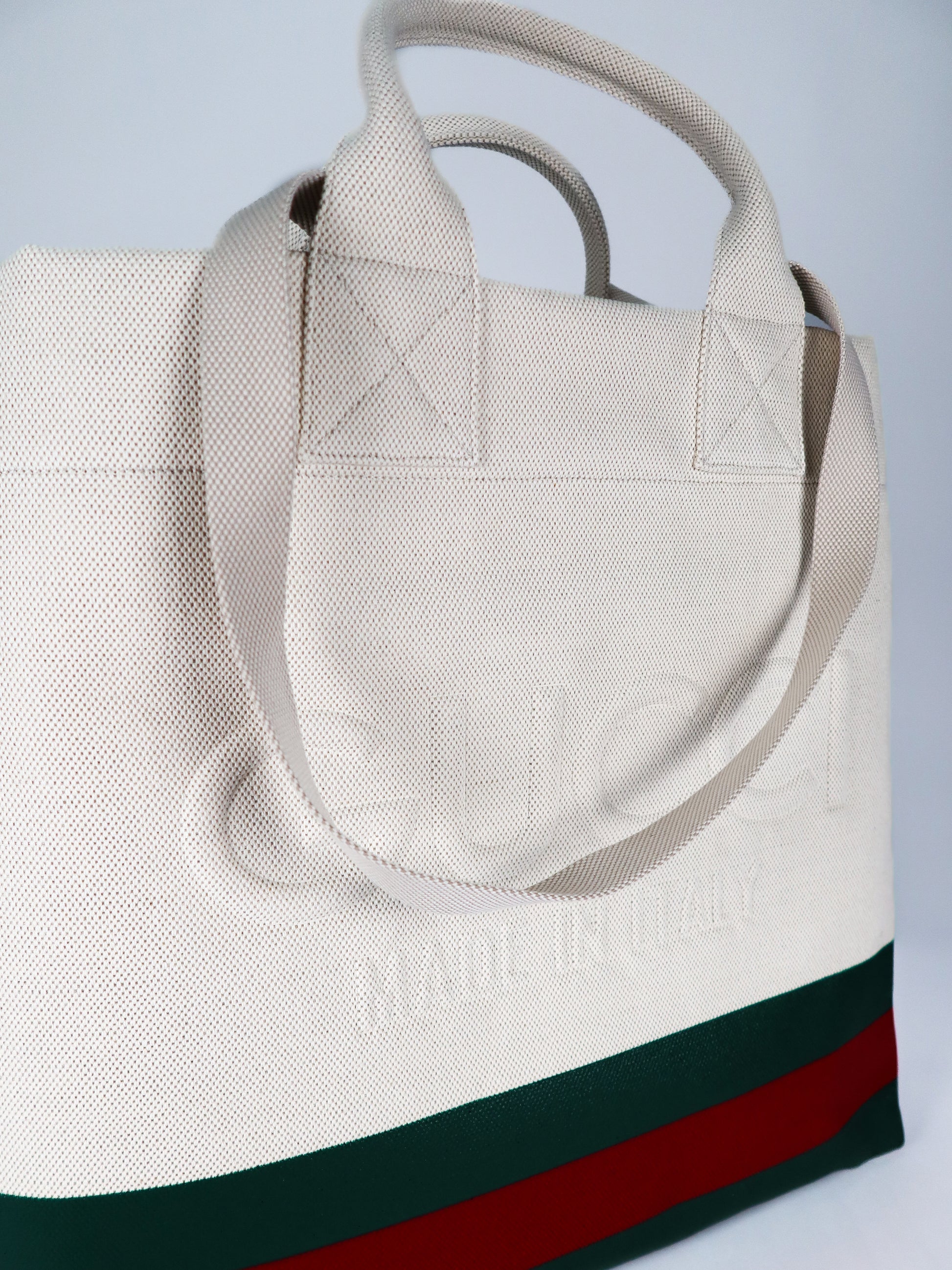 A timeless piece from Gucci’s coveted Ophidia line, this brand new canvas tote captures the house’s blend of heritage detailing and modern ease. Crafted in Italy from durable ivory canvas, it features an embossed GUCCI Made in Italy logo that lends subtle texture and sophistication. The base is finished with the signature green-and-red Web stripe—an instantly recognisable hallmark of the house—bringing a bold, classic touch to the clean silhouette. Designed with sturdy top handles and a spacious interior, it’s perfect for everyday carry, from errands to travel. Presented brand new with tags and complete with its original dustbag, this tote elevates any wardrobe with effortless luxury.