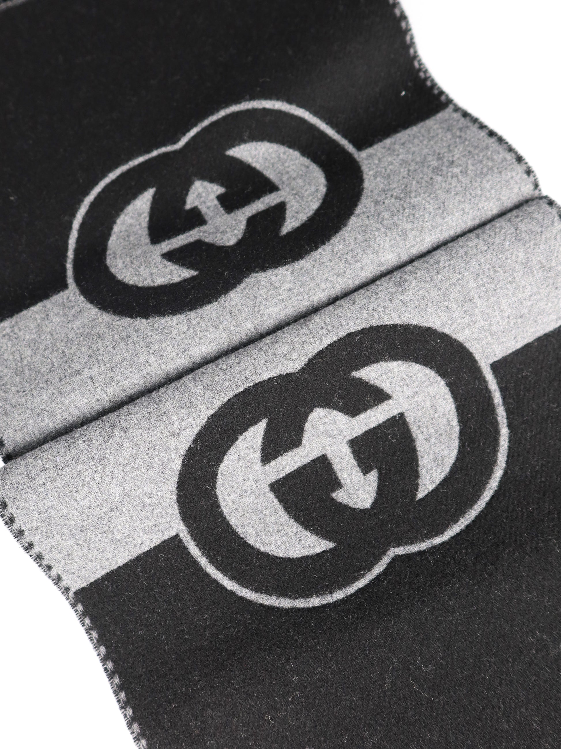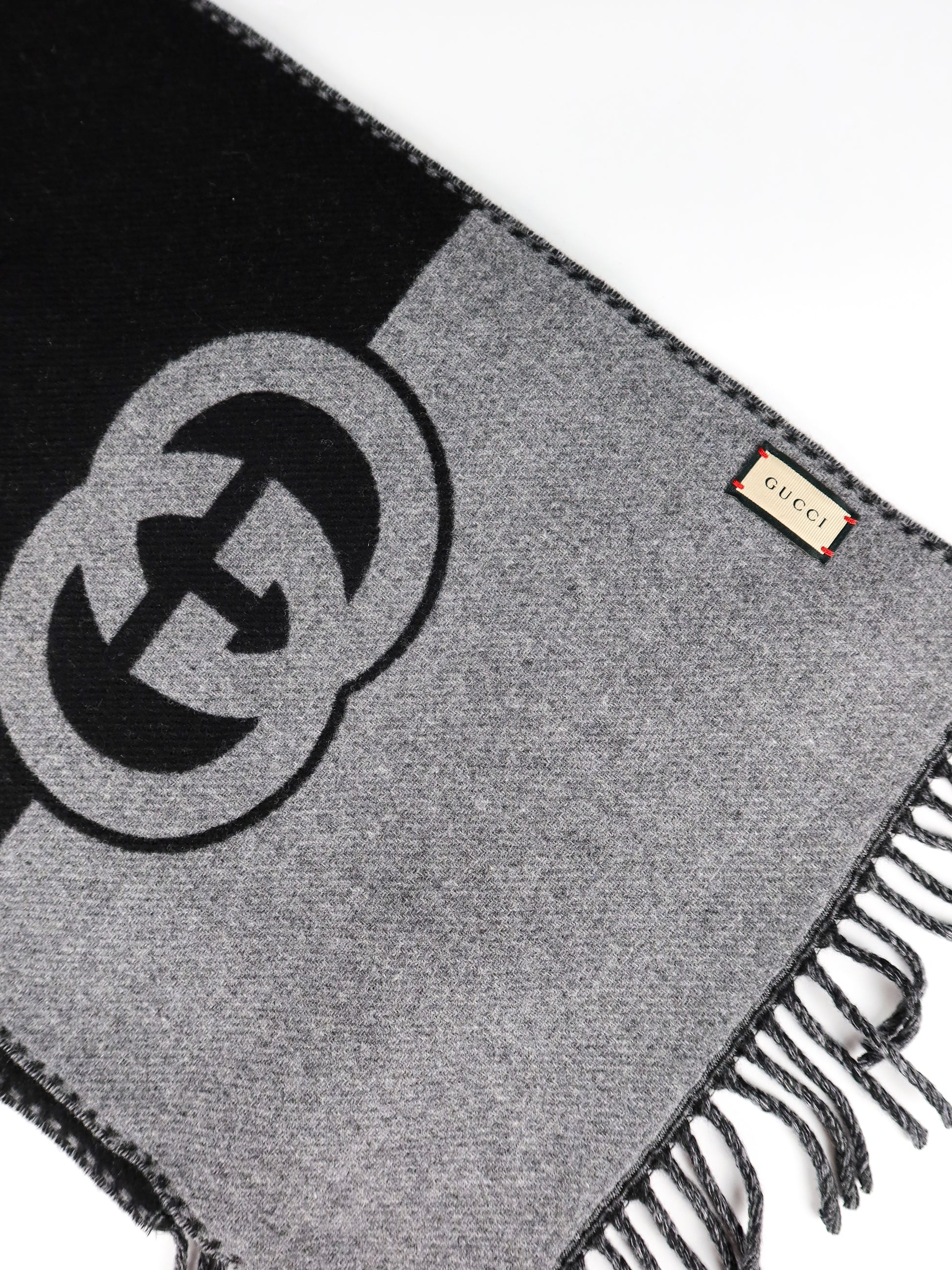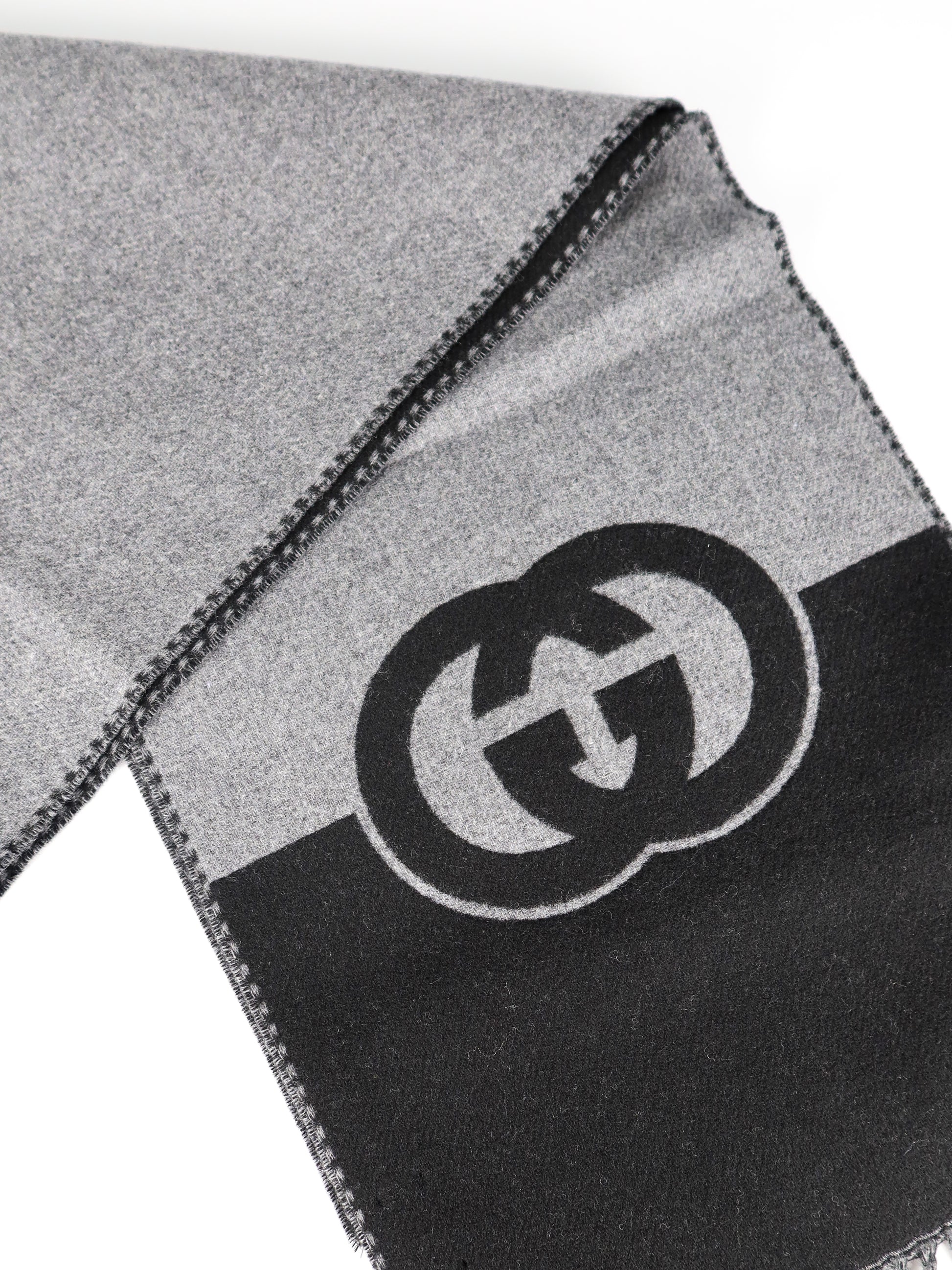 A sleek essential from Gucci, this brand new cashmere scarf showcases the house’s iconic interlocking G motif in bold monochrome. Knitted from luxuriously soft cashmere in panels of light grey and deep black, it’s finished with whipstitched edges that lend subtle structure and refinement. Generously proportioned for wrapping or draping, it brings instant designer polish and cosy warmth to any cold-weather look, and comes complete with original tags attached.