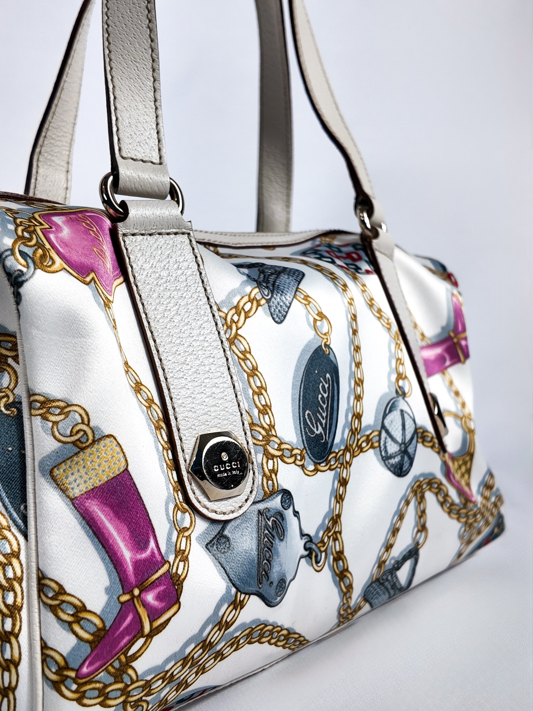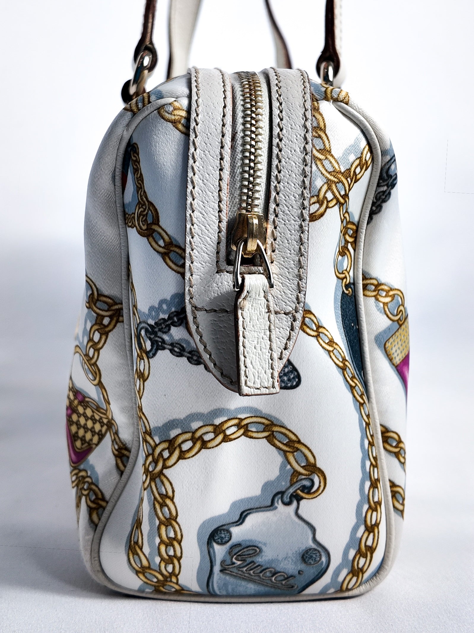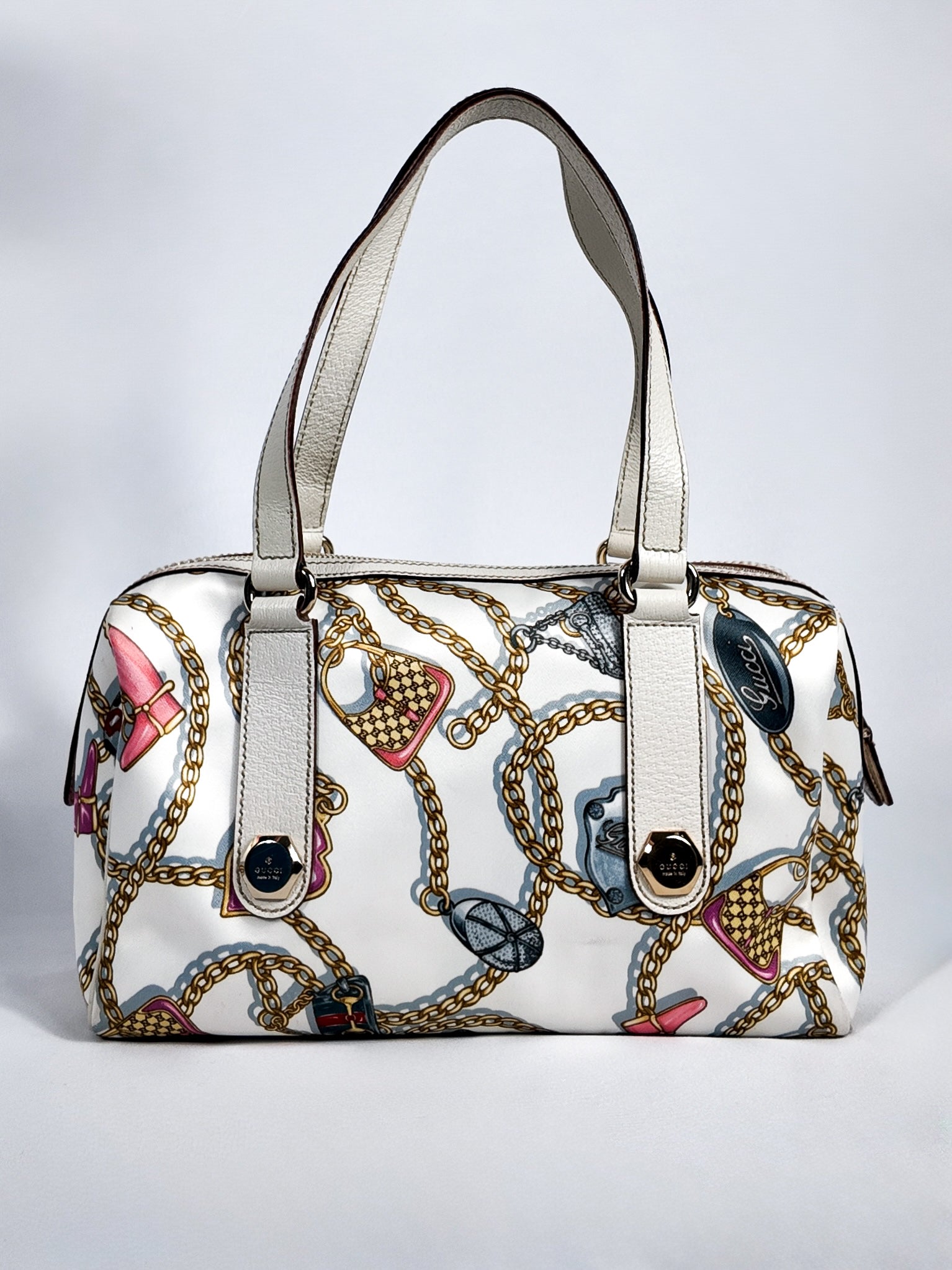 A playful classic from the early 2000s, this vintage Gucci Charmy Bag is crafted in satin with a whimsical chain-and-charm print featuring lipstick, bows, and signature emblems. Trimmed with white leather and finished with gold-tone hardware, it captures the bold, eclectic spirit of the era. With its structured shape and double top handles, it’s both practical and stylish, making it a standout everyday piece. In excellent vintage condition, this bag remains a rare and eye-catching addition to any collection.