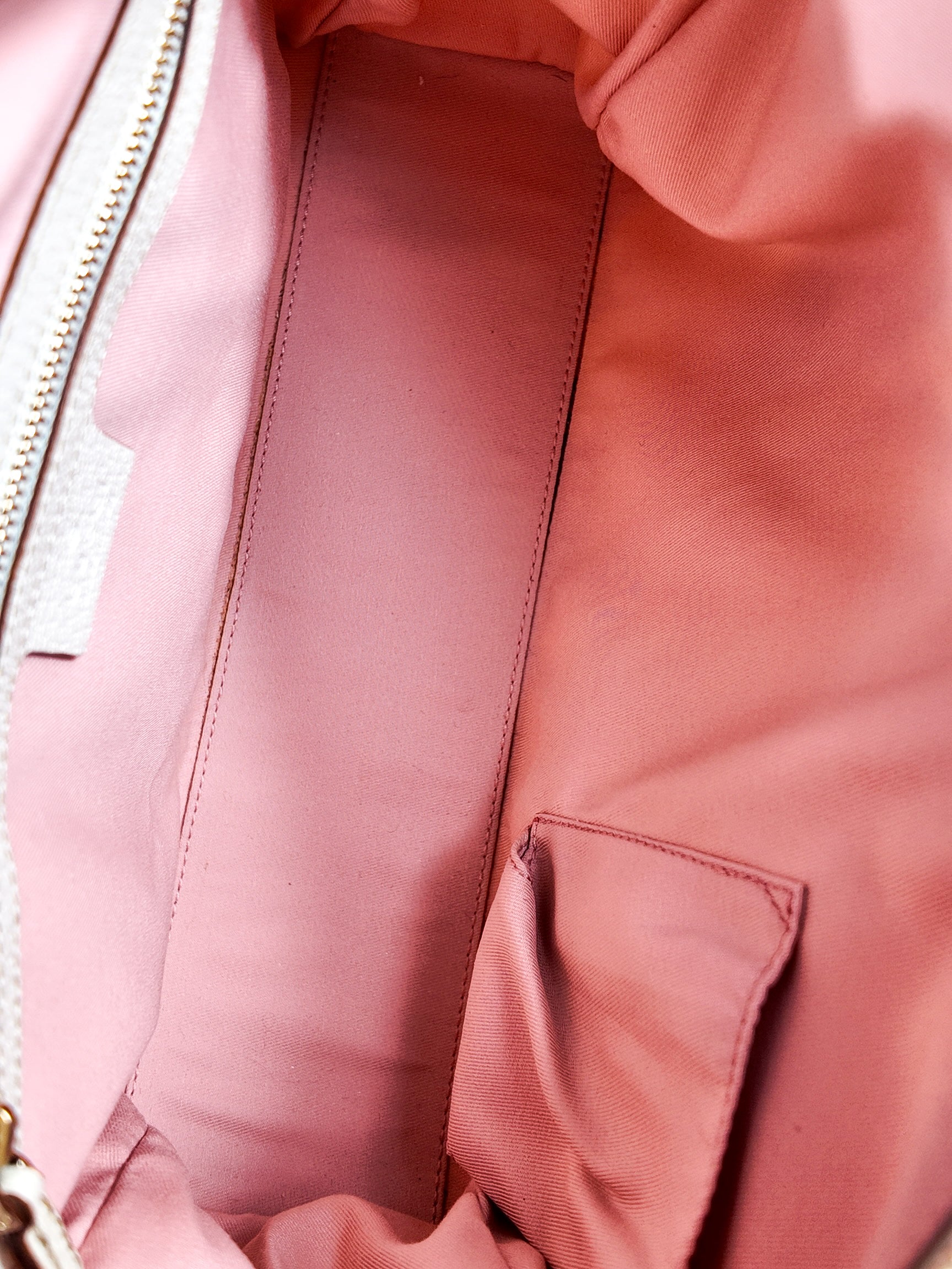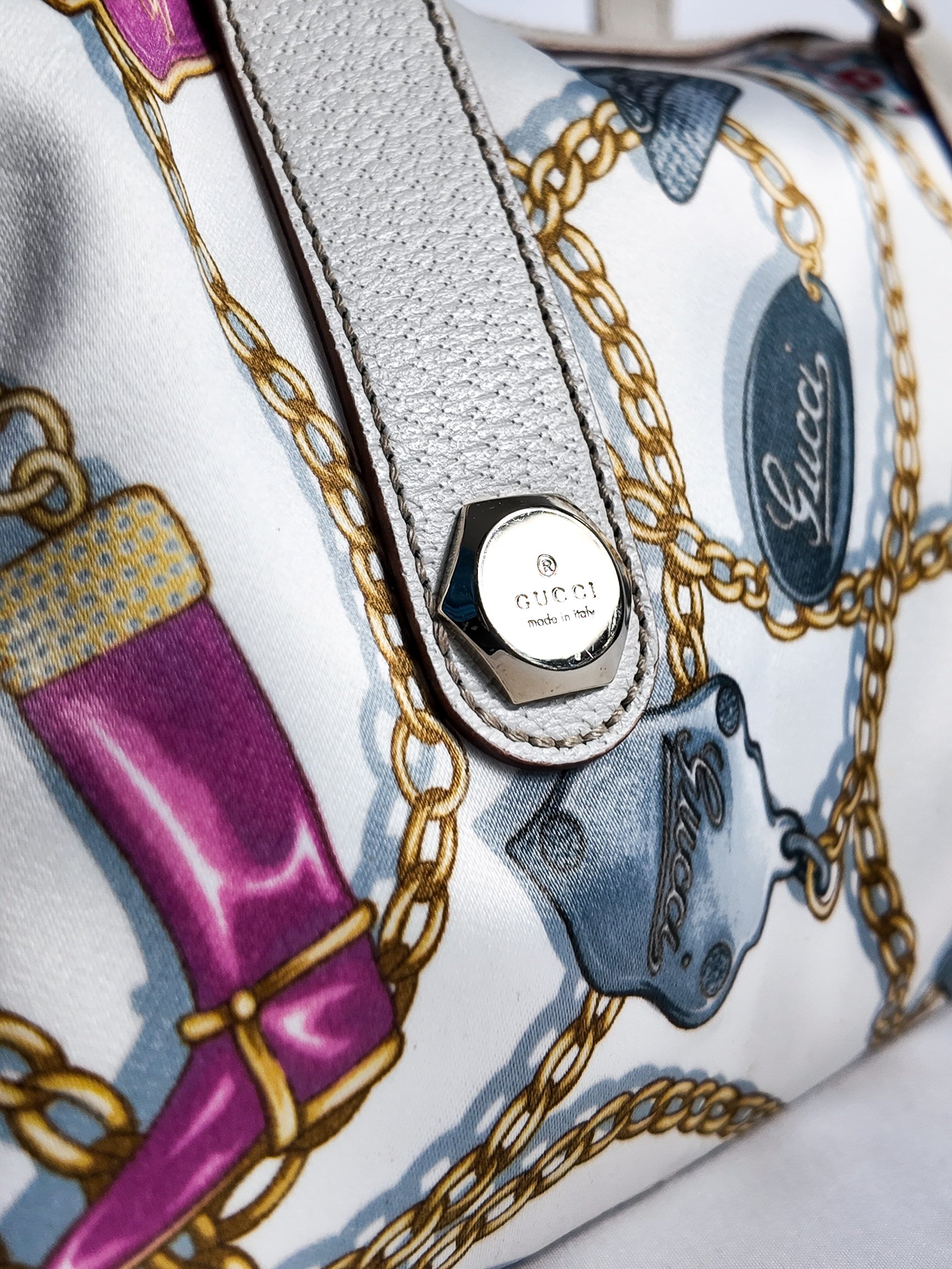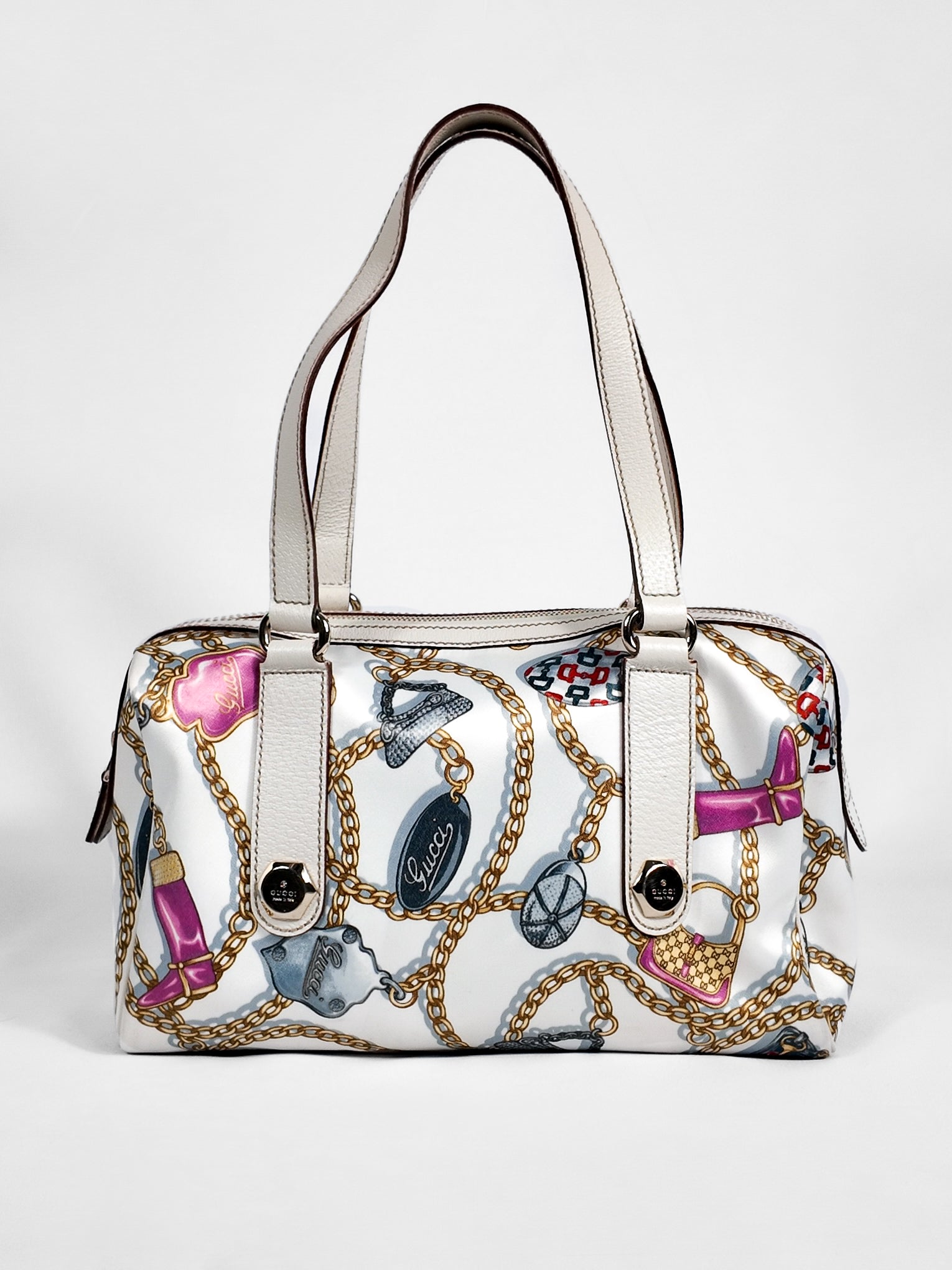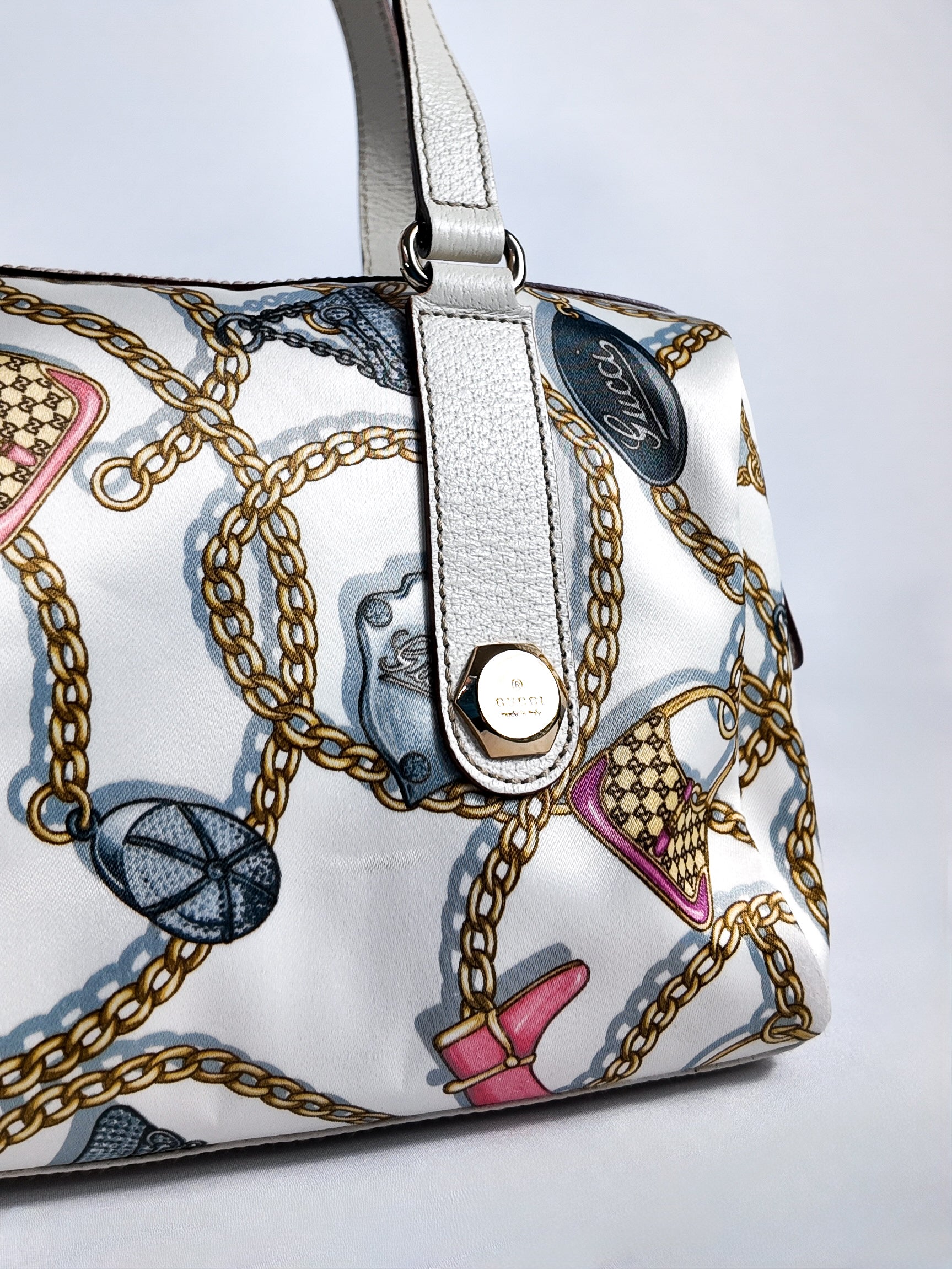 A playful classic from the early 2000s, this vintage Gucci Charmy Bag is crafted in satin with a whimsical chain-and-charm print featuring lipstick, bows, and signature emblems. Trimmed with white leather and finished with gold-tone hardware, it captures the bold, eclectic spirit of the era. With its structured shape and double top handles, it’s both practical and stylish, making it a standout everyday piece. In excellent vintage condition, this bag remains a rare and eye-catching addition to any collection.