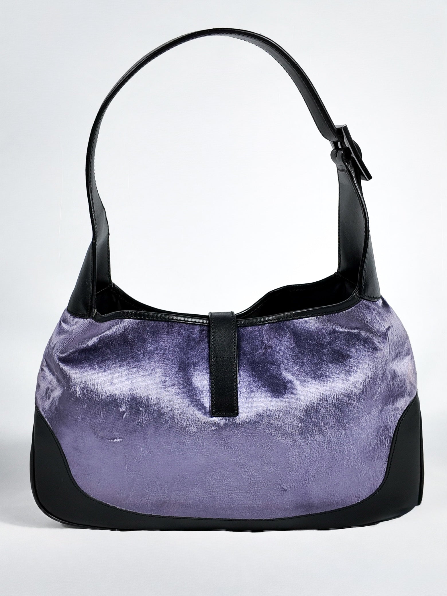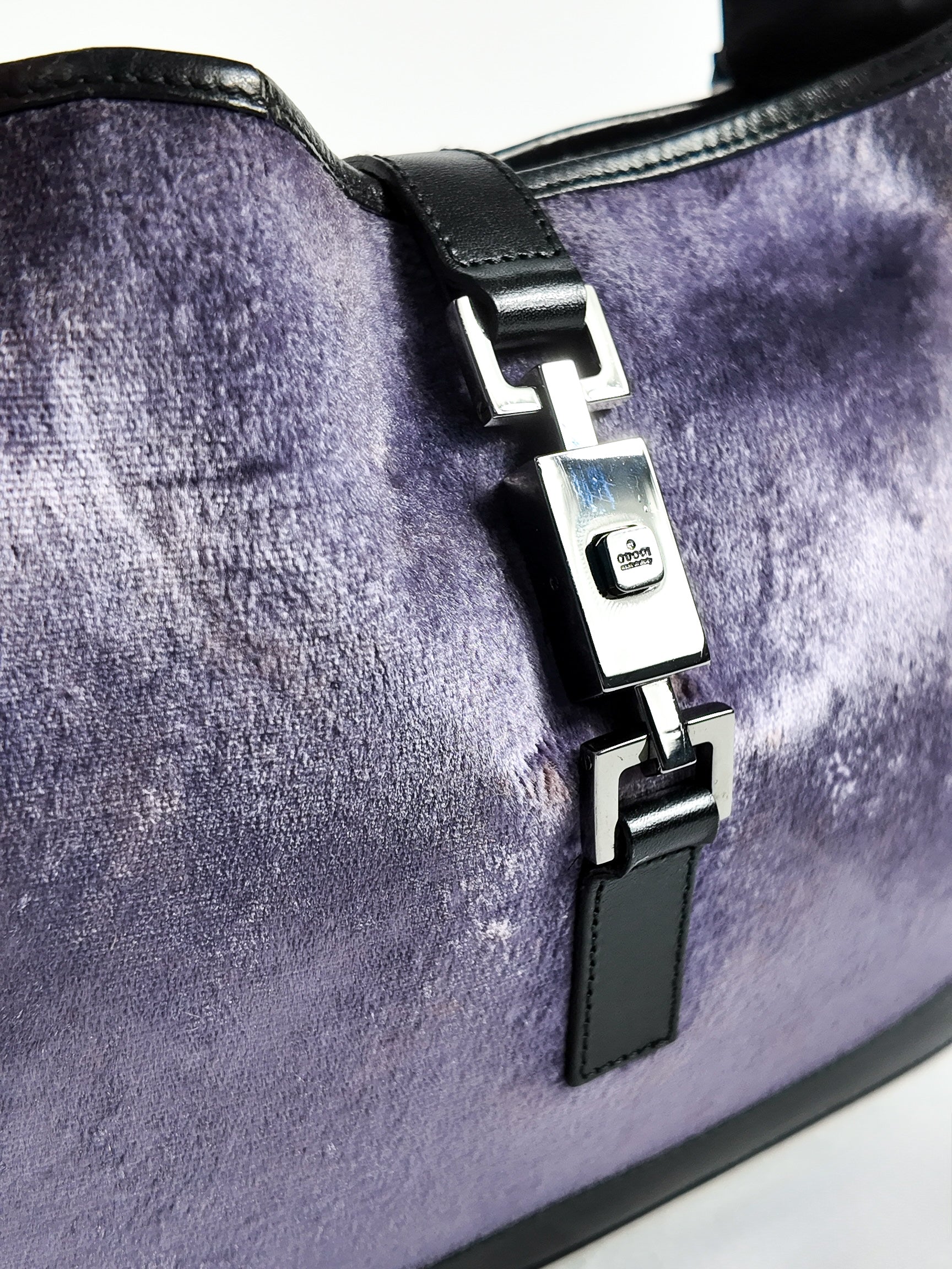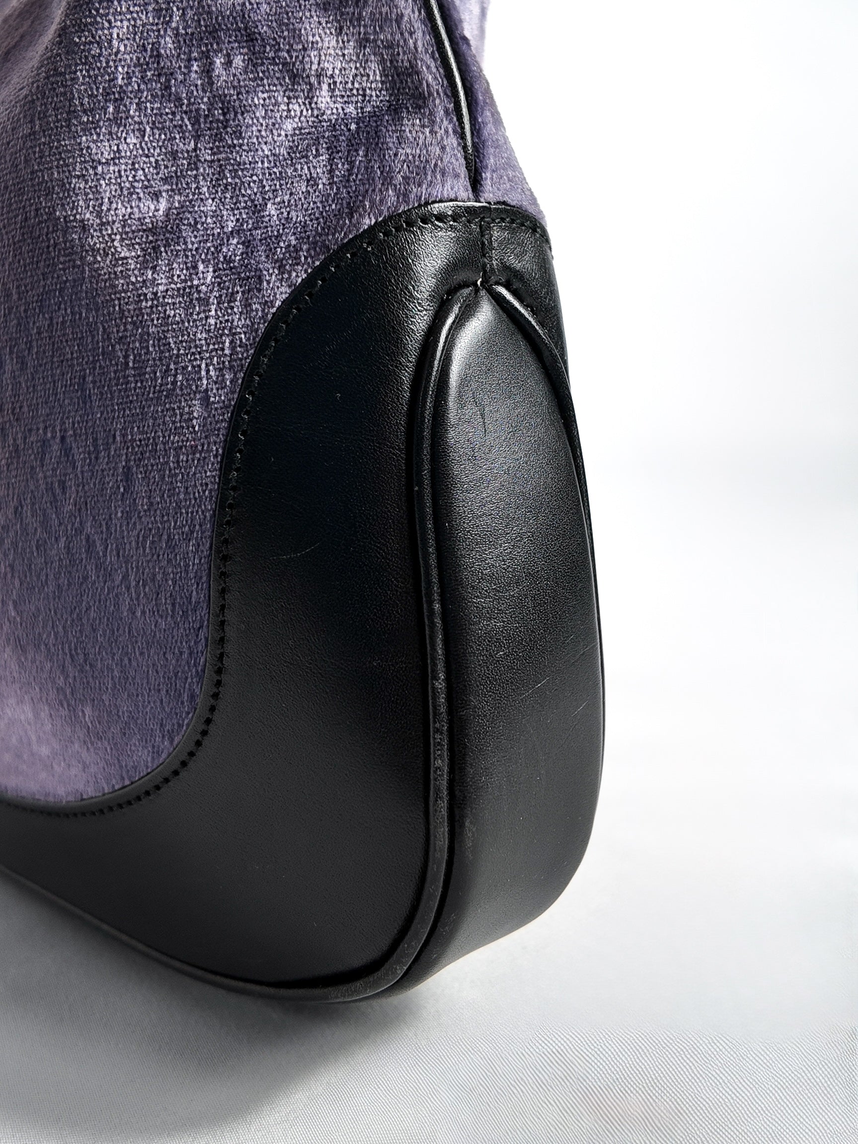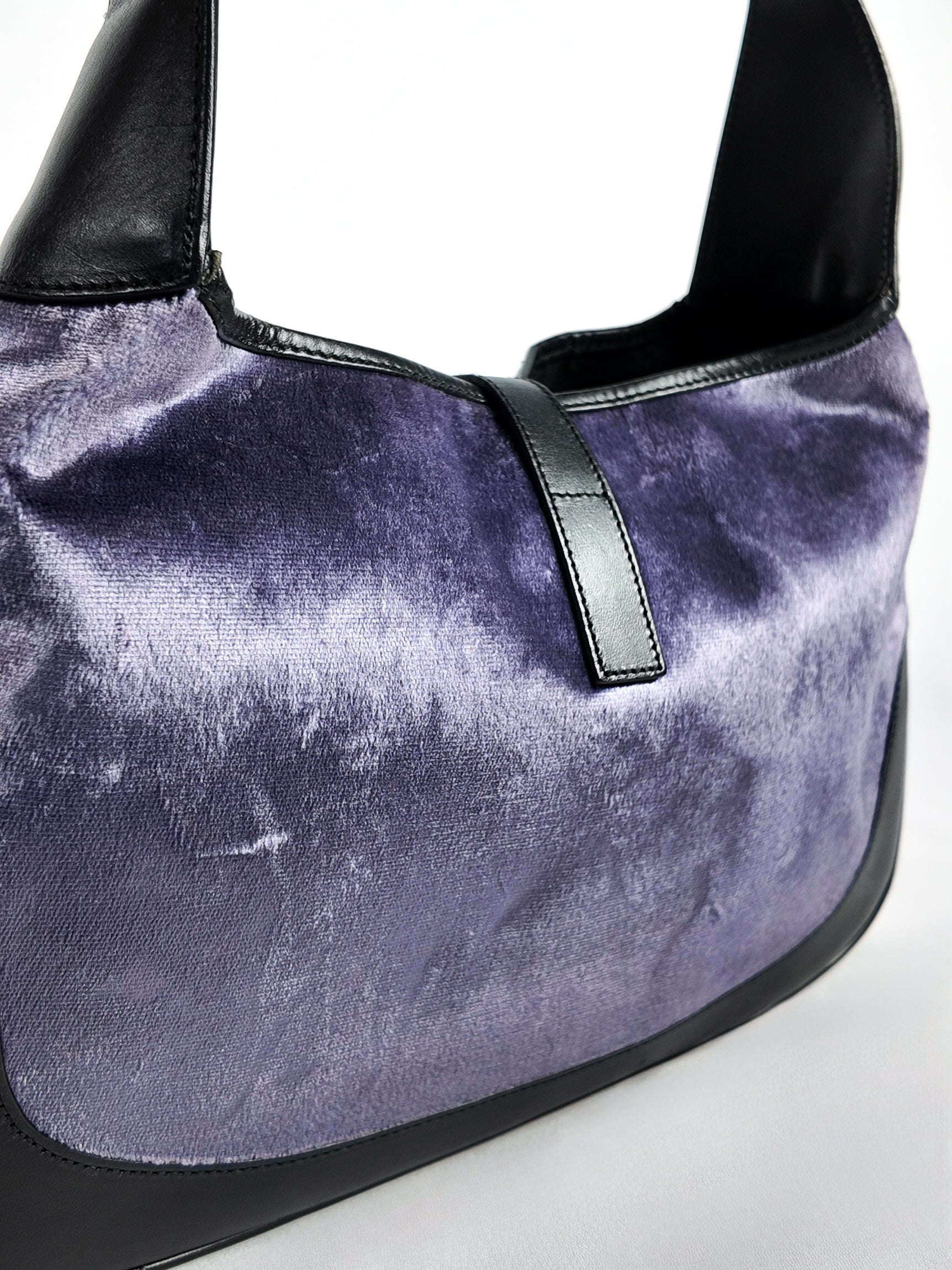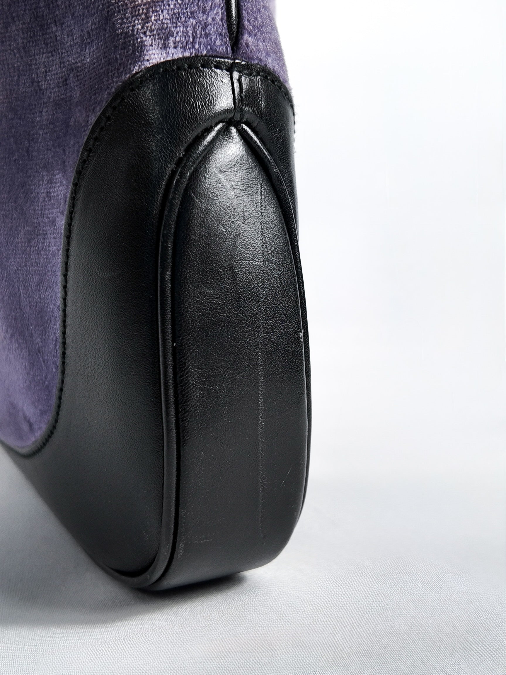 An iconic piece from the Tom Ford era, this vintage Gucci Jackie bag captures the bold sophistication of early-2000s design. Crafted in plush purple velvet with black leather trim, it features the signature piston-lock closure and sleek curved silhouette that define the Jackie line. With its structured shoulder strap and distinctive finish, this standout piece embodies Gucci’s daring yet timeless aesthetic under Ford’s creative direction. A rare find in good vintage condition, it remains a statement accessory with enduring appeal.