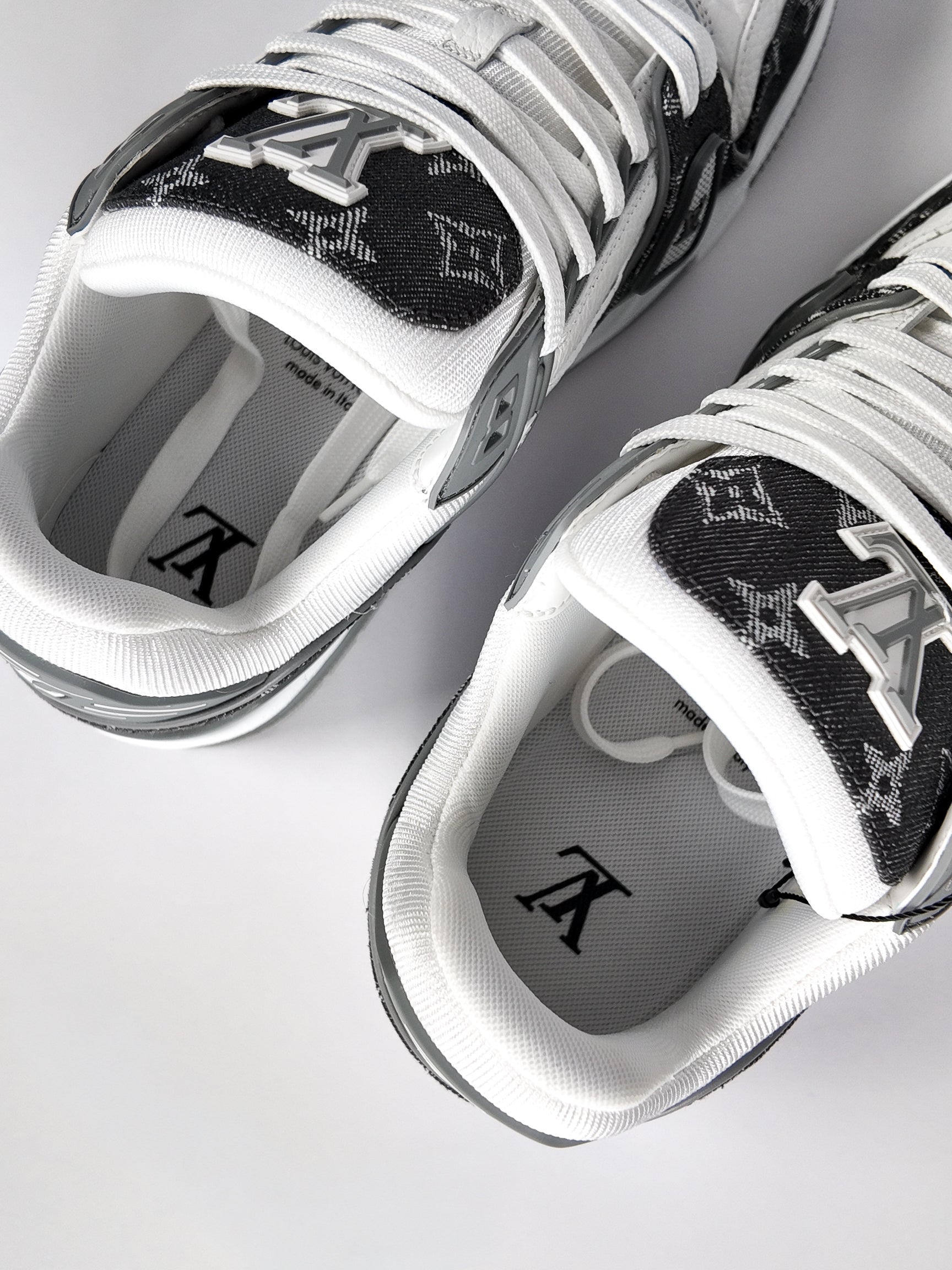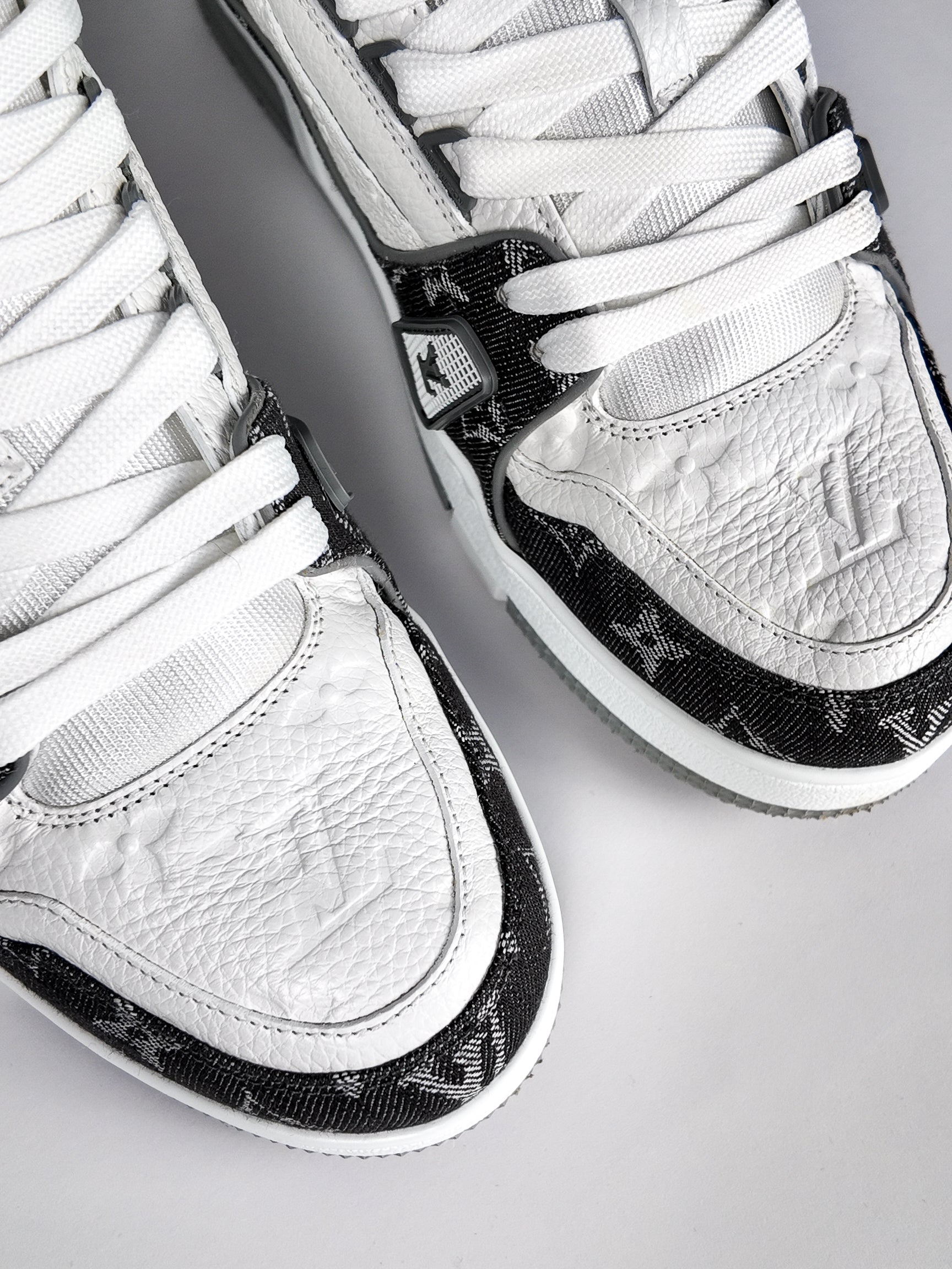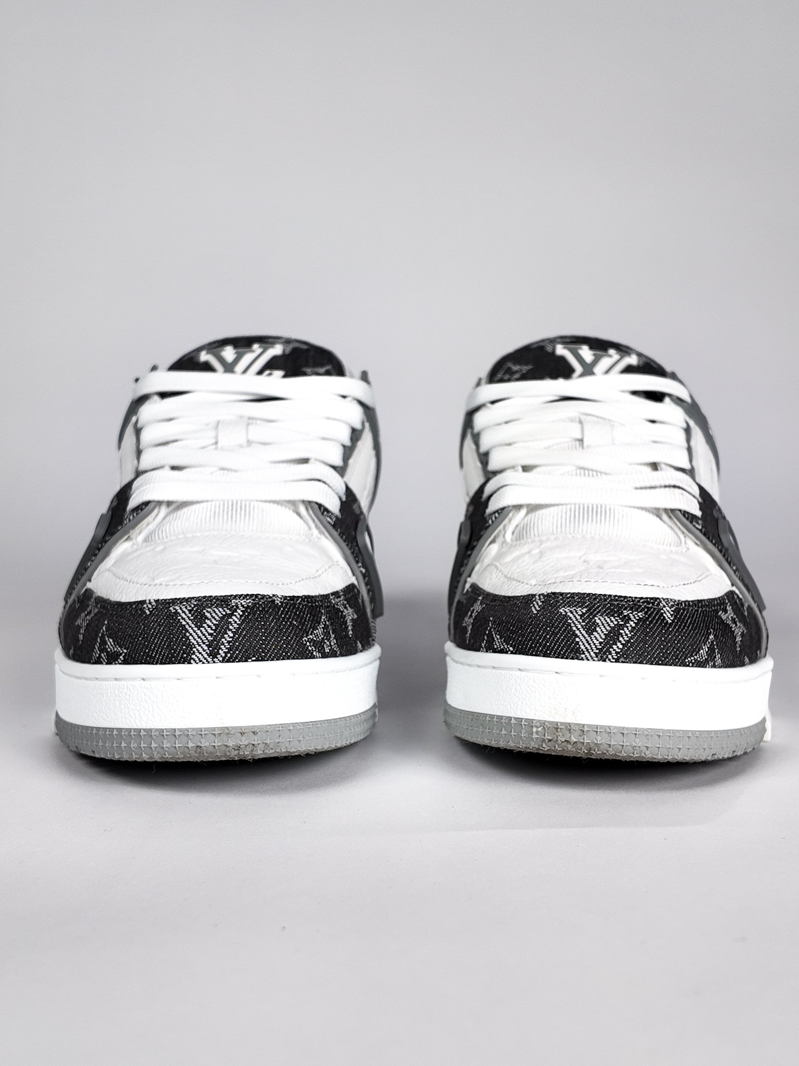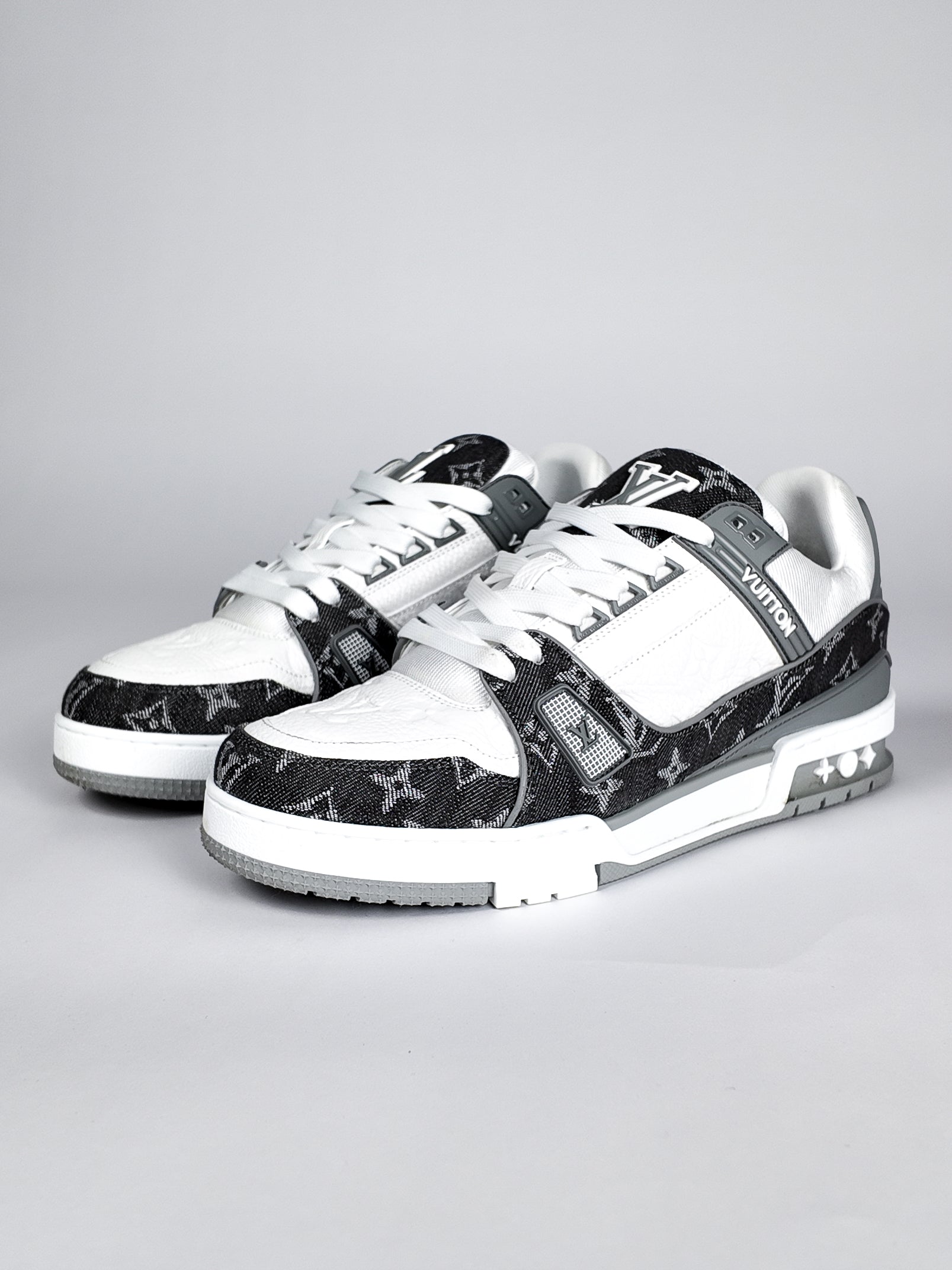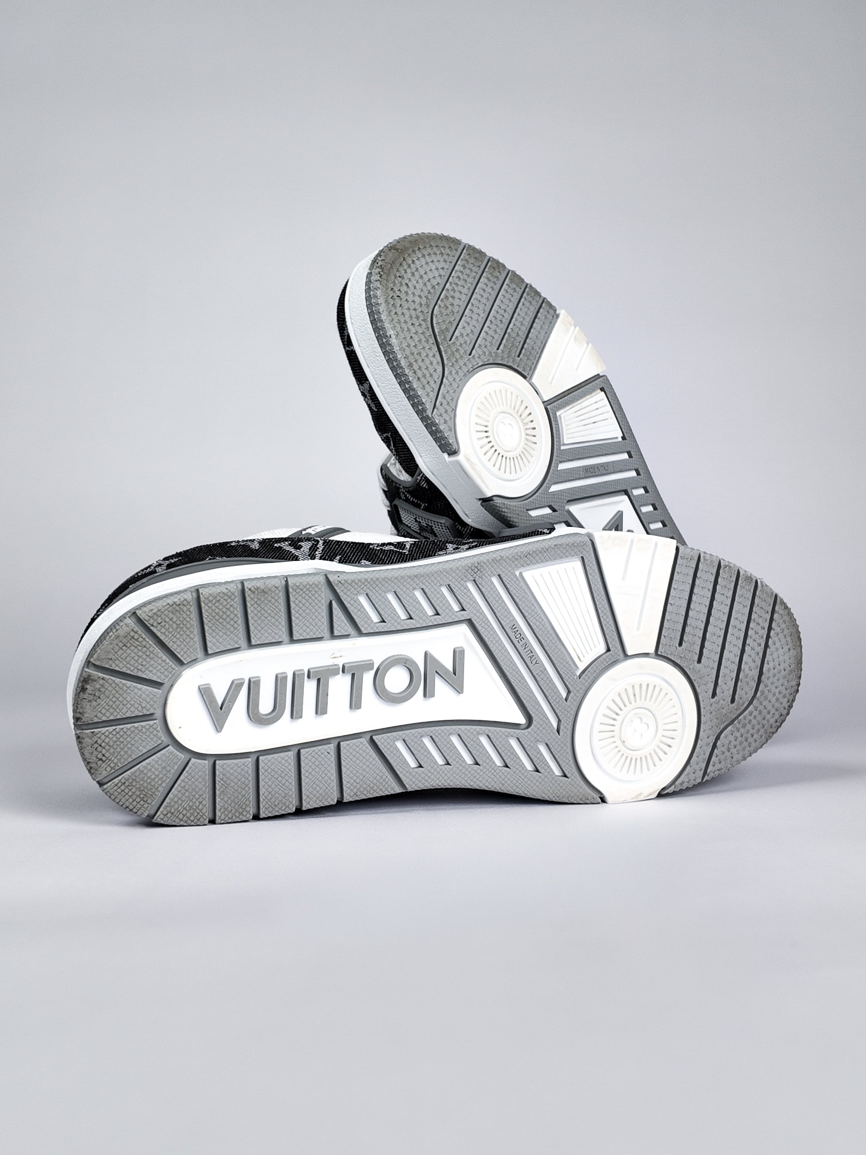 Designed by Virgil Abloh, the Louis Vuitton LV Trainer reimagines a classic basketball silhouette through the house’s luxury lens. Crafted from monogram denim and smooth calf leather, this pair combines statement detailing with superior craftsmanship. Pre-loved and in excellent condition. Comes with box and dust bag. Note: these fit large — we recommend sizing down.