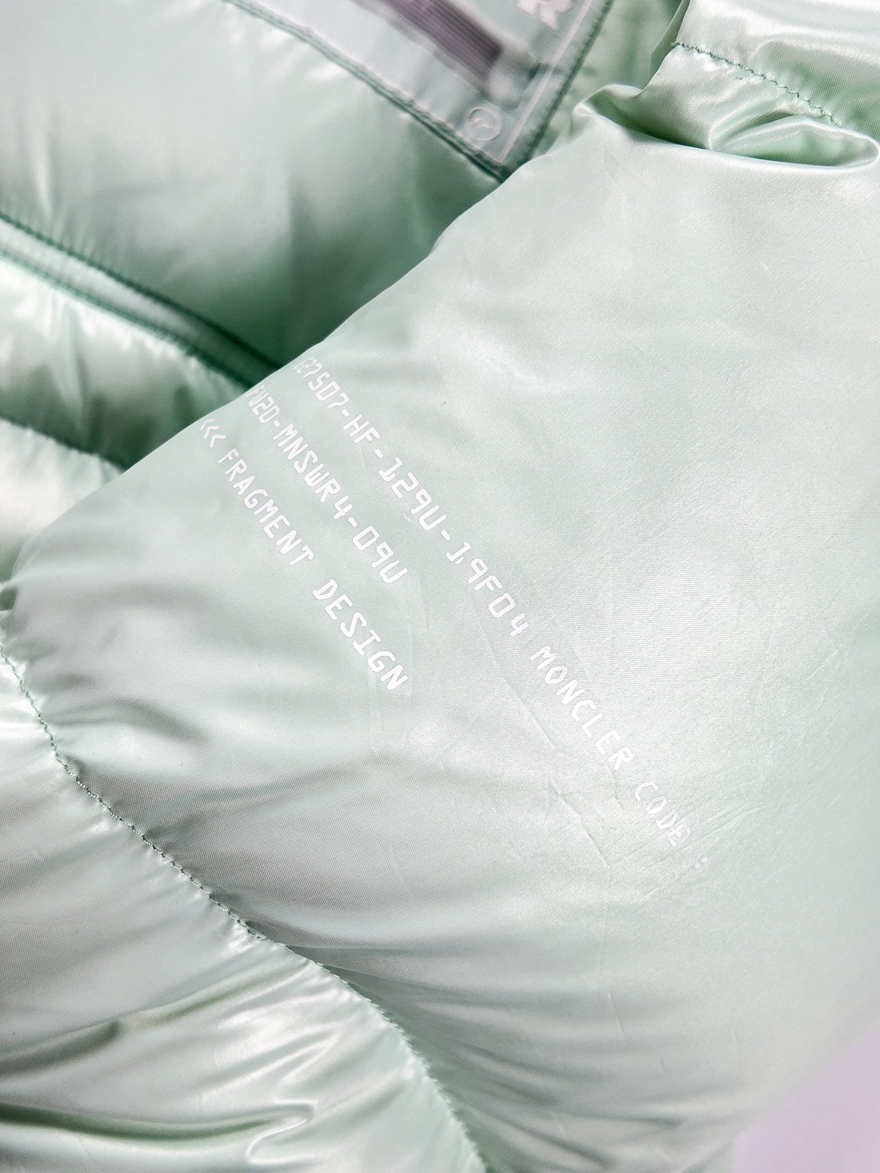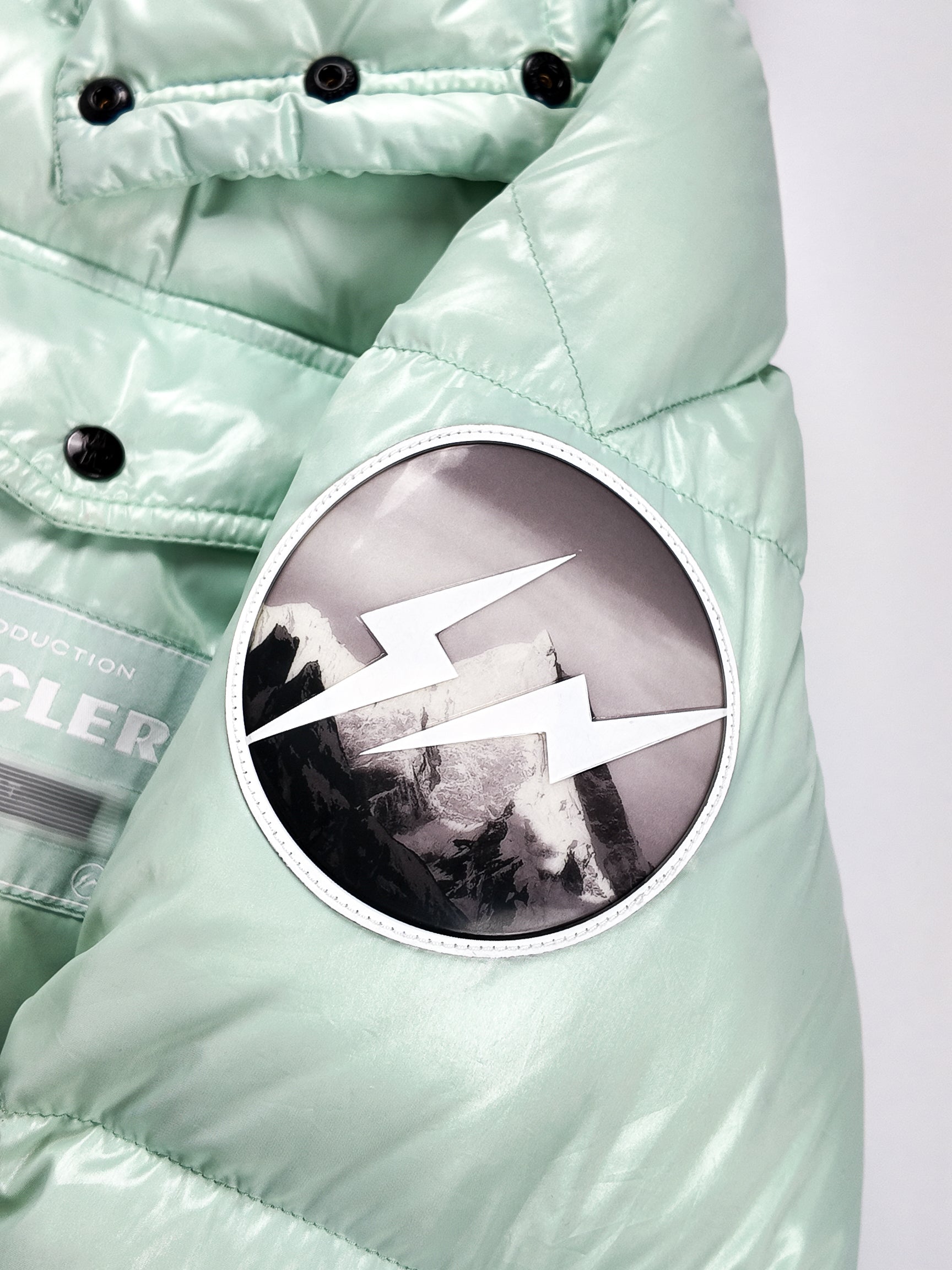 A standout design from the Moncler Genius collaboration with Hiroshi Fujiwara, this mint green jacket blends the house’s alpine heritage with Fragment’s modern street influence. Crafted from glossy nylon laqué with insulating down fill and oversized baffles, it’s detailed with a monochrome mountain-and-lightning badge at the sleeve in place of the classic rooster logo. Finished with a high-performance hood, bungee adjusters and zipped pockets for practical everyday wear.
