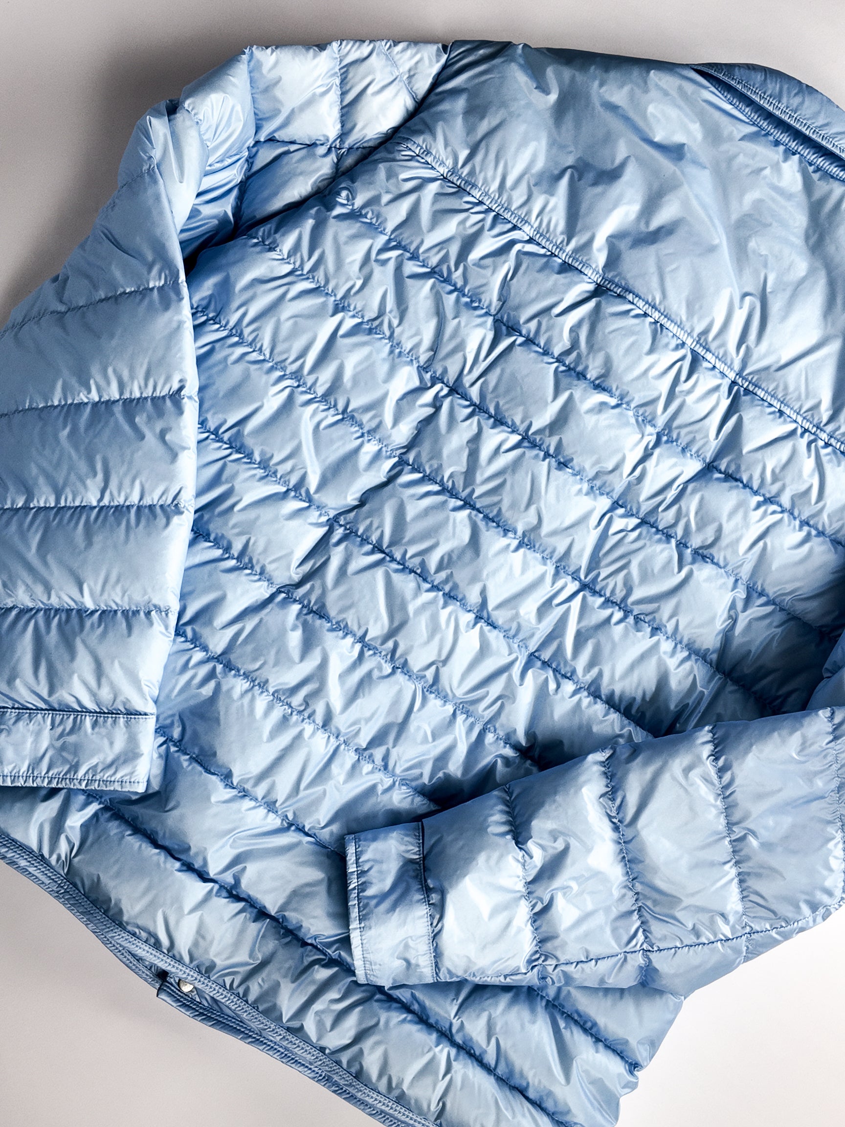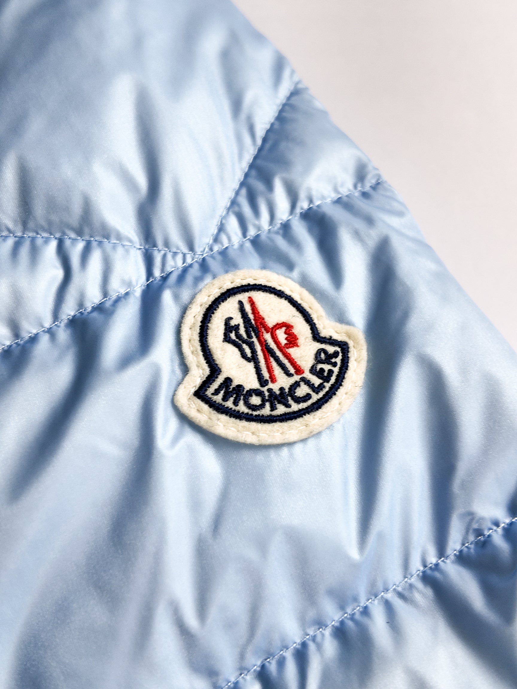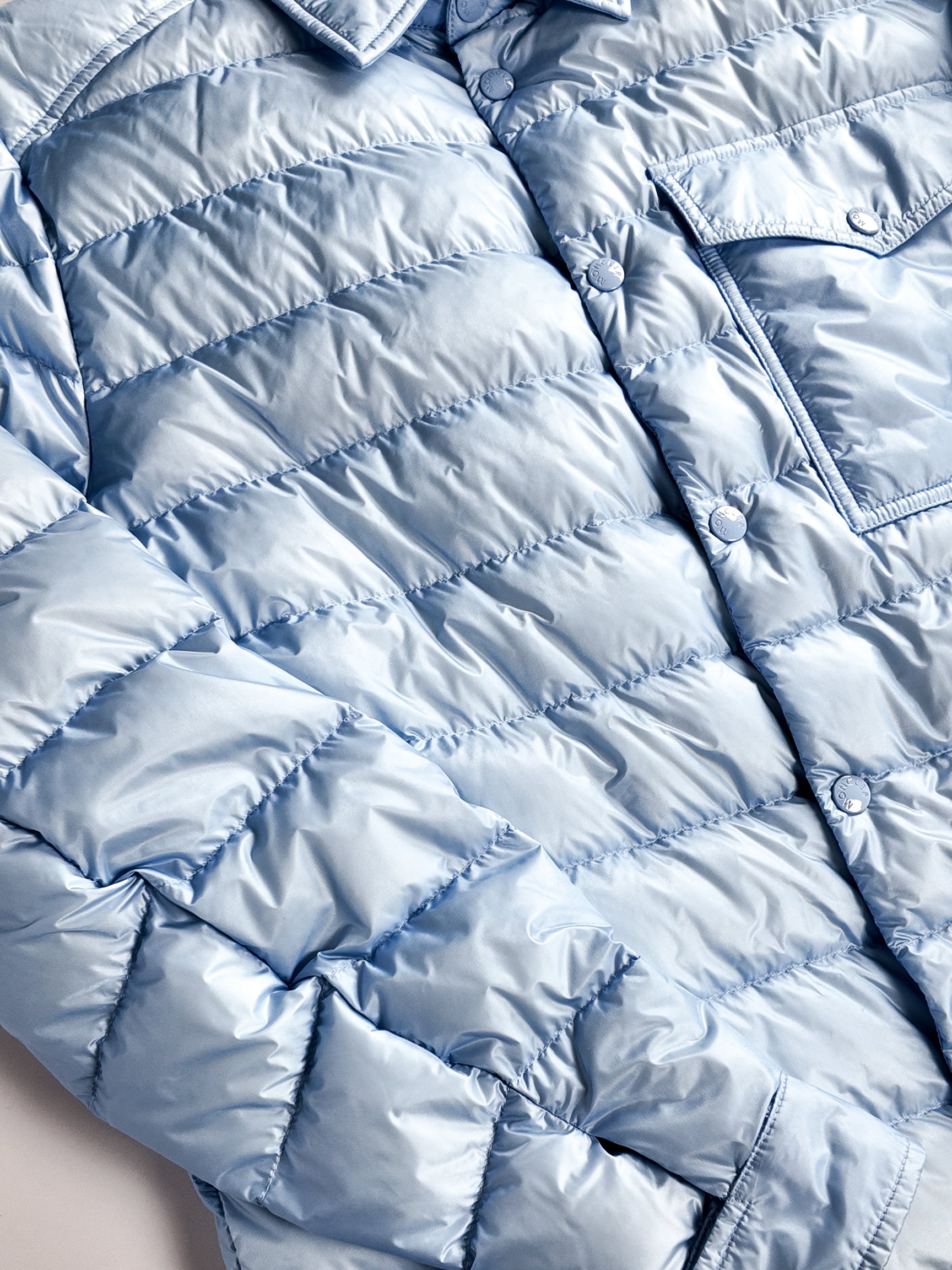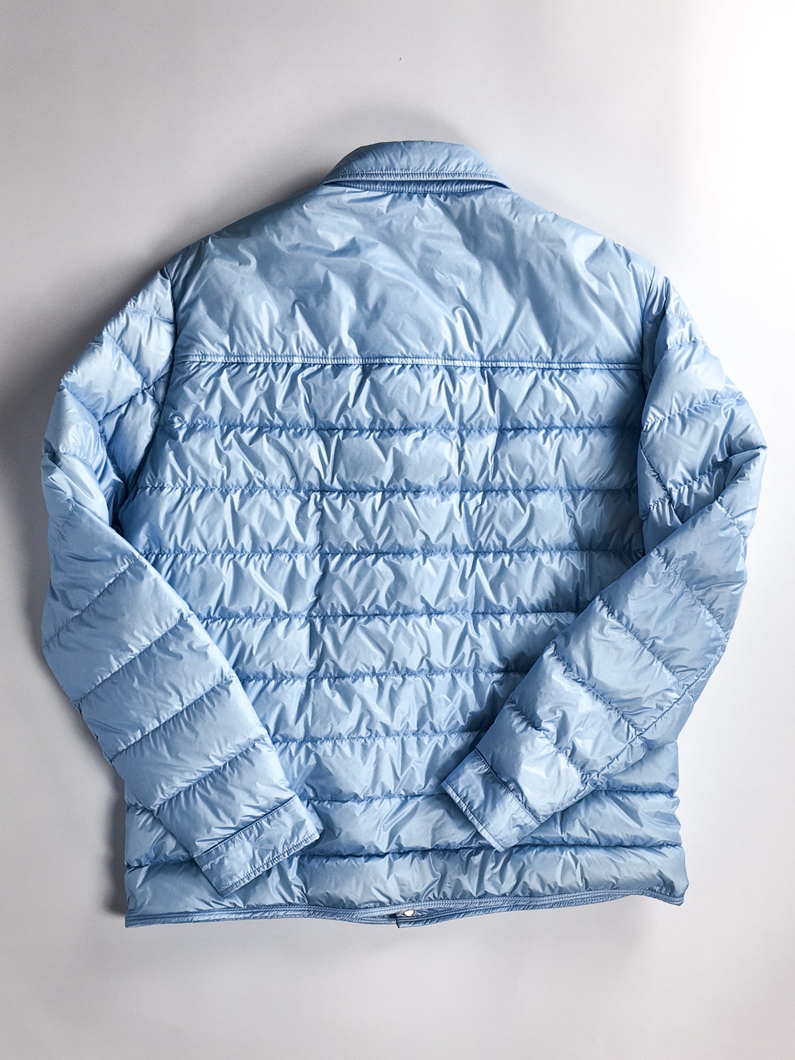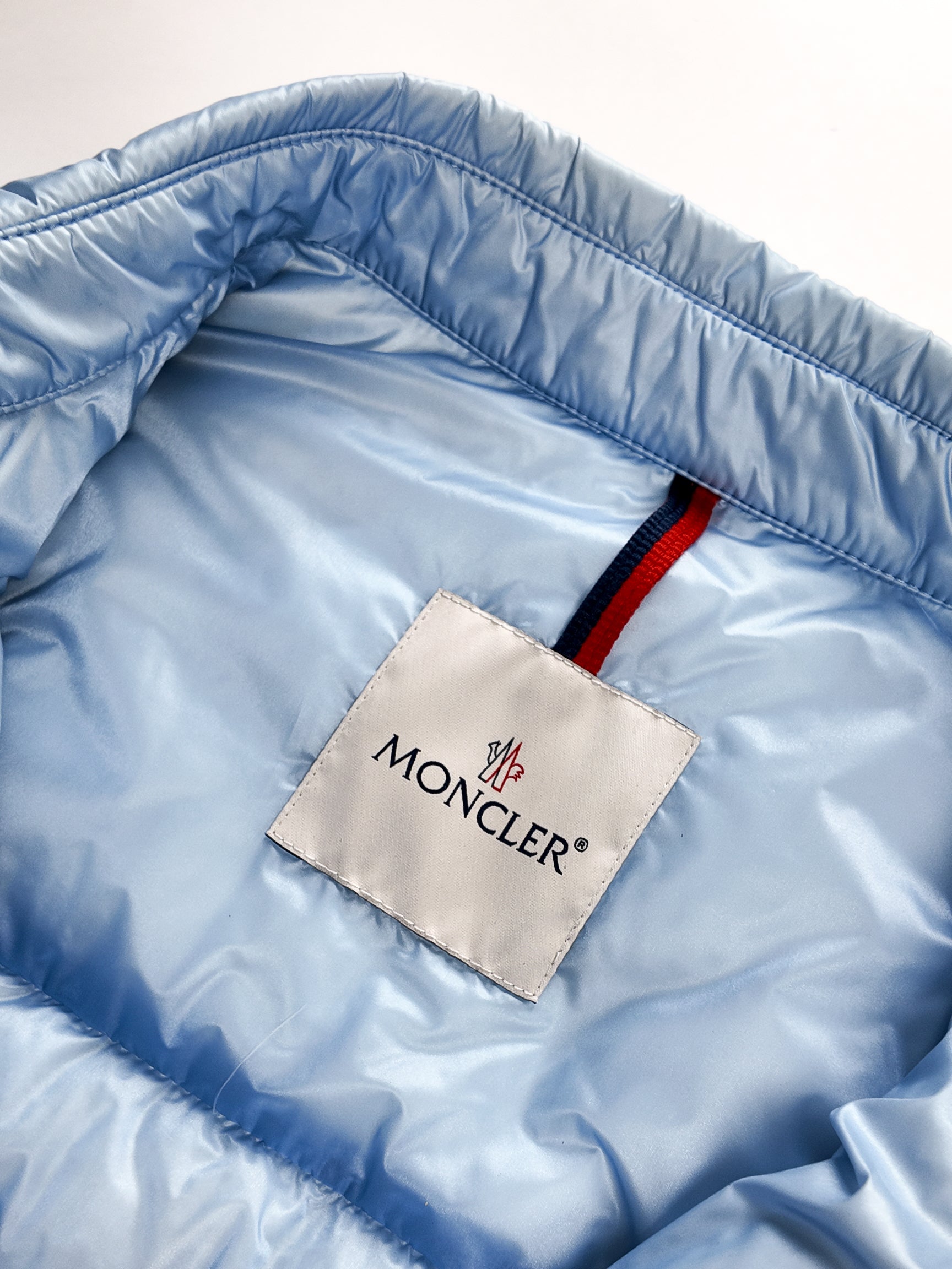 The Moncler Tinibres jacket offers a sleek, modern take on lightweight outerwear. Crafted in a pale blue quilted nylon with down filling, it features a sharp shirt-style collar, press-stud closure, and the signature Moncler logo patch on the sleeve. Effortlessly bridging casual and refined, this piece is ideal for transitional dressing. Pre-loved and in pristine condition - worn once.