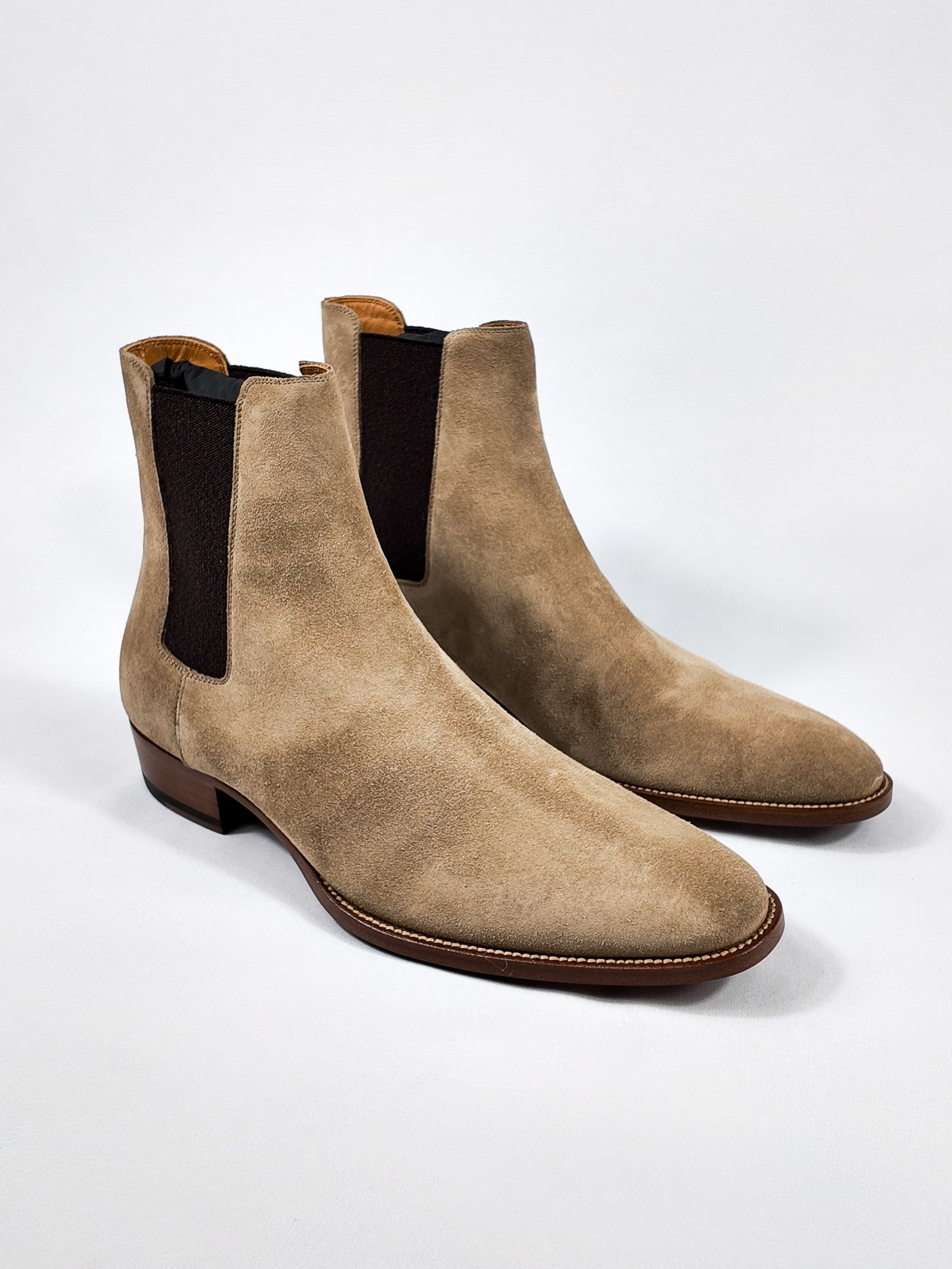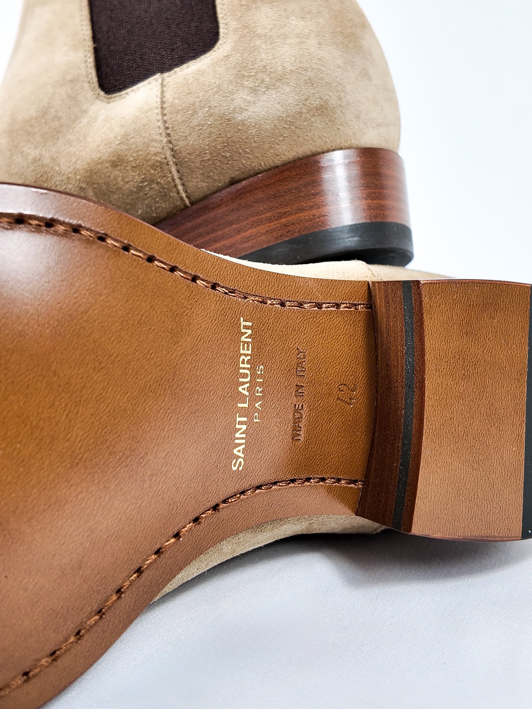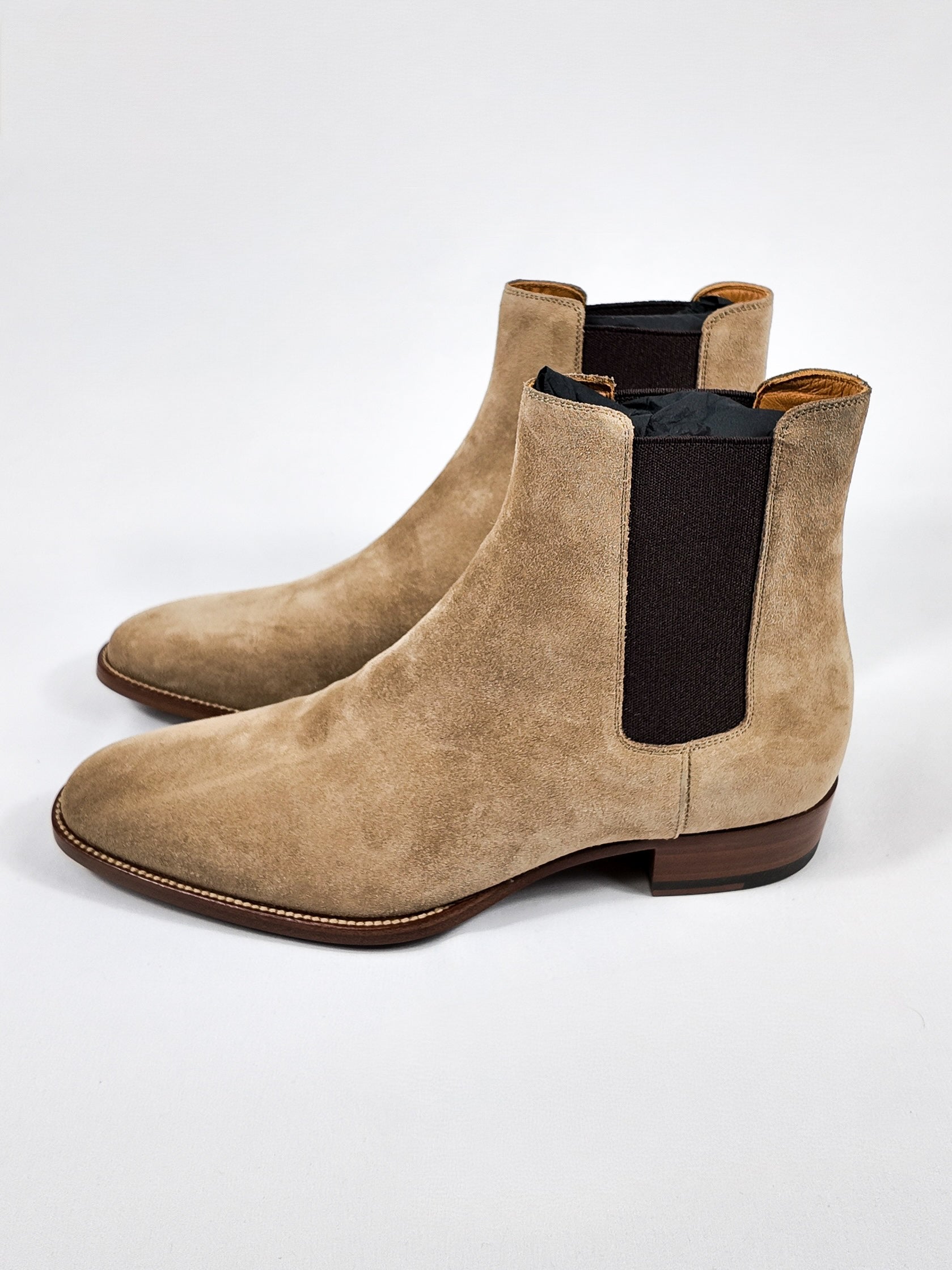 The ultimate staple for the modern wardrobe. These Saint Laurent Wyatt boots are crafted from soft beige suede with elastic side panels, and a slim, streamlined silhouette. Designed for understated luxury and everyday versatility. Brand new with tags, they’re the perfect finishing touch for both casual and elevated looks.
