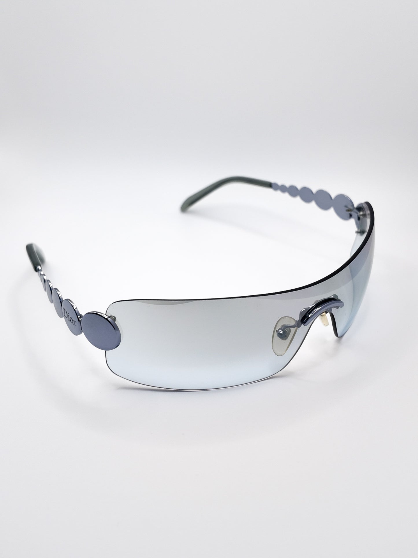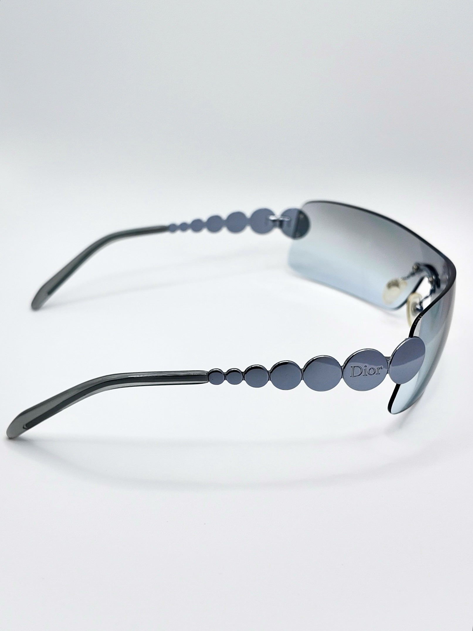 Make a sleek statement with these vintage Dior Ruthenium/N sunglasses—an early 2000s icon that oozes futuristic flair. Featuring a frameless shield lens with a cool blue gradient tint and signature Dior circle-detail arms in ruthenium-tone metal. Vintage and in excellent condition, these are a rare find and can make any outfit.